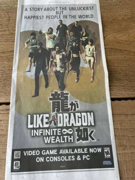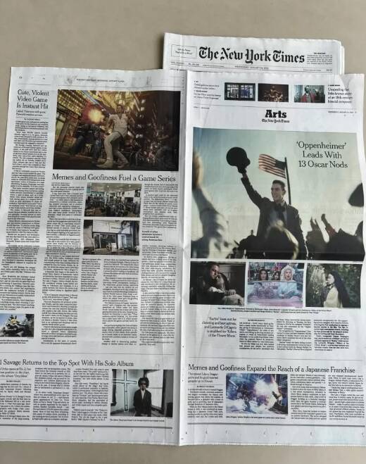 世嘉旗下名作续篇《如龙8:无尽财富》刚刚于1月26日发售,登陆PC、PS5、PS4、Xbox Series X/S和Xbox One平台,收获各方好评,日前美国《纽约时报》刊登了整版《如龙8》广告,并与GTA作了比较评论,堪称风格迥异的“日版”GTA。