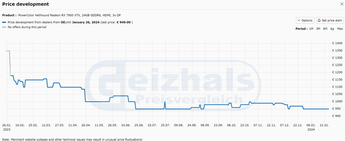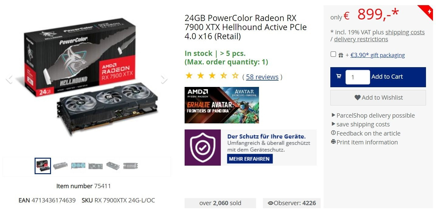 比如在德国大型零售商MindFactory,撼讯的RX 7900 XTX暗黑犬已经杀到了899欧元,相比一年前的首发价1599欧元已经便宜了接近45%,几乎腰斩!