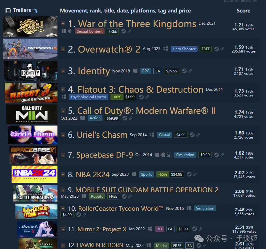 在2023年,《三国杀》的差评地位曾遭遇过两次冲击,一次是《守望先锋》上架,一次是《NBA 2k》上架,其中《守望先锋》那次还兴起了“你不给守望先锋打差评,我可要给三国杀打好评了”的要挟风潮,更加是证明了《三国杀》的差评含金量。