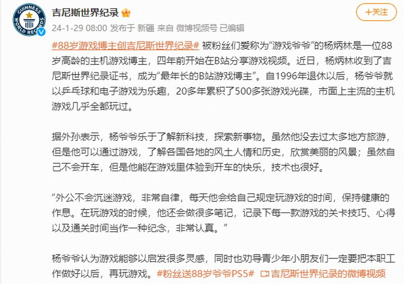 近日吉尼斯世界纪录官方宣布,被粉丝们爱称“游戏爷爷”的88岁的杨炳林荣获“最年长的B站游戏博主”称号。