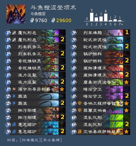 兄弟们大家好哈,这月又又又登顶了哈哈,今天这套淤泥术应该是补丁之后的最强卡组,简单说下打法留牌哈,首先一费必留哈,然后手里如果有两个4费的情况下(477和468)地标也必留,一般1费上怪然后二费锻造468或者上2费怪,然后3费地标4费上477或者468点地标,我这套带了两张亵渎如果问为什么的话只能说一句无敌儿,就是猛,亵渎能解铺场或者小怪,给淤泥桶创造打脸的机会,关键是配合325刷淤泥桶简直爽歪歪,乐章是在前期没有淤泥节奏的情况下补中期节奏或者解场站怪等等,泰坦主要补后期质量(或者梦想一手乐章抽泰坦)大体就简单说这些,刚下播饿不行了准备吃饭了,要是有其他问题可以来直播间斗鱼6551720问你橙弟儿,祝大家都能用这套猛猛上分,ok了兄弟们先溜了哈哈。