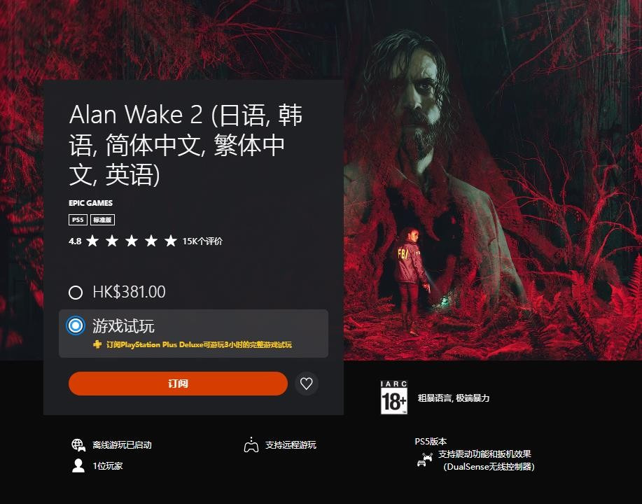 港服PlayStation Plus第三档会员新增了试玩游戏:《心灵杀手2》,现在订阅该服务的玩家最多可以试玩《心灵杀手2》完整游戏三个小时,购买正式版后,所有试玩的进度和奖杯都将被继承。
