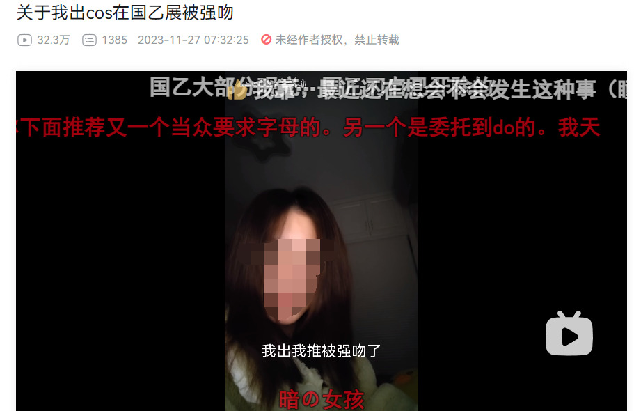 (在另一位coser出男角色惨遭路人梦女强吻的视频中,甚至还有这样的逆天评论)