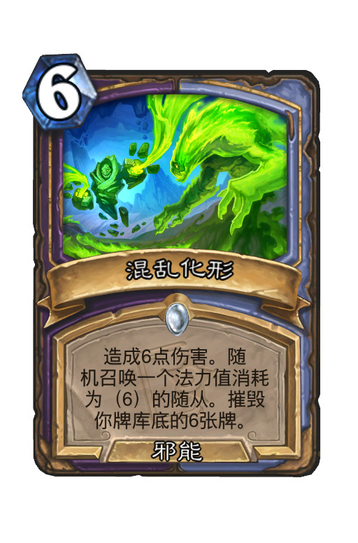 魔化形态1费+3+3,很容易联想到曾经的力代斩杀,但在这套牌里,斩杀的任务一般会被交给更加强大的淤泥体系。所以这张卡真正的定位是一张优质的辅助随从交换的buff卡。举个例子。4费回合,对面场上站个33,可以打出轮式淤泥怪325,加上魔化后变58,解掉场面后变成55,直到自己的下个回合,会变回25,等于没受伤。在前期上手一张这个,可以有效掌握4费前的随从交换节奏。