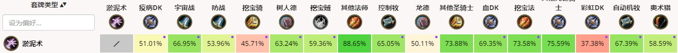 不得不说,在当前版本,最适合快速冲分的卡组绝对非快攻淤泥术莫属,超短的对局时间,不是你死就是我亡,在HS上的最新数据显示,对战绝大部分卡组淤泥术都能够优开,甚至于很多人不看好的对战病DK的对局中表现也是不错,仅在对战挖宝骑和彩虹DK时会落于下风。
