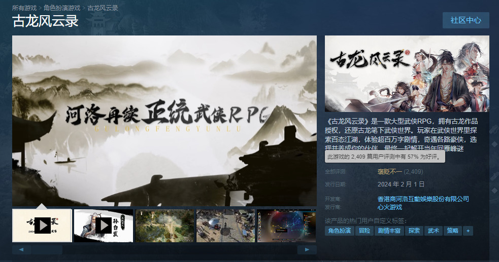 河洛武侠RPG新作《古龙风云录》已正式发售,售价108元。目前该作在Steam上总评为“褒贬不一”,好评率57%,有老玩家表示失望透顶。