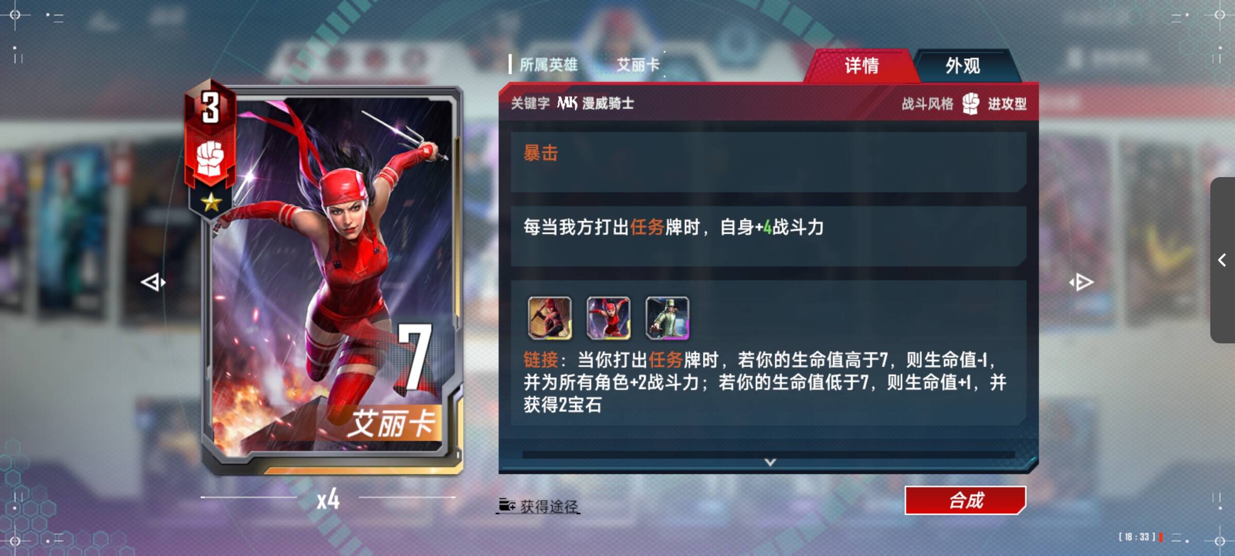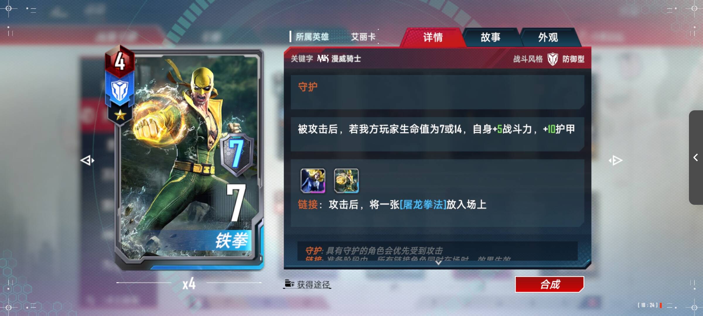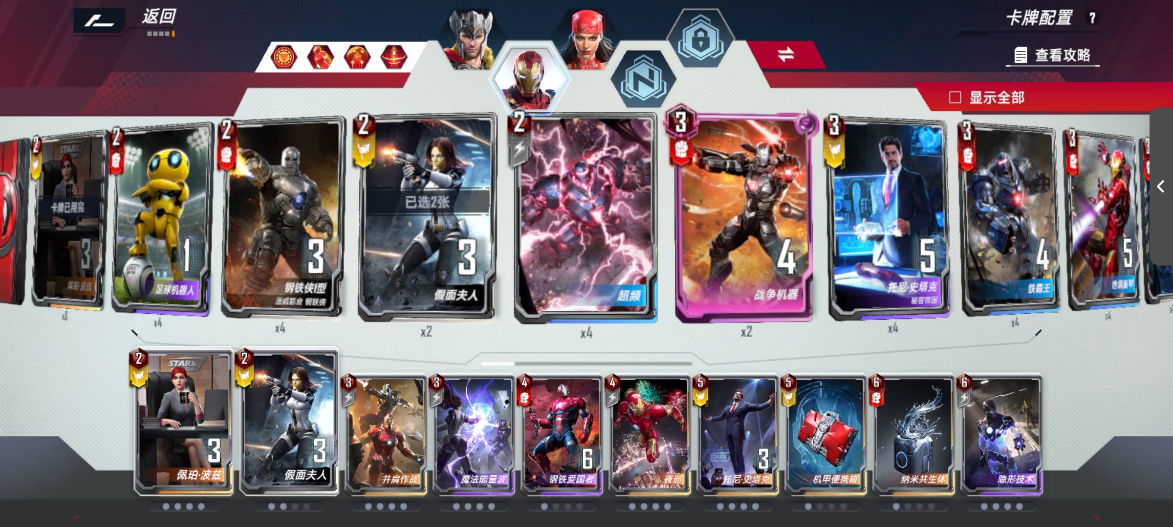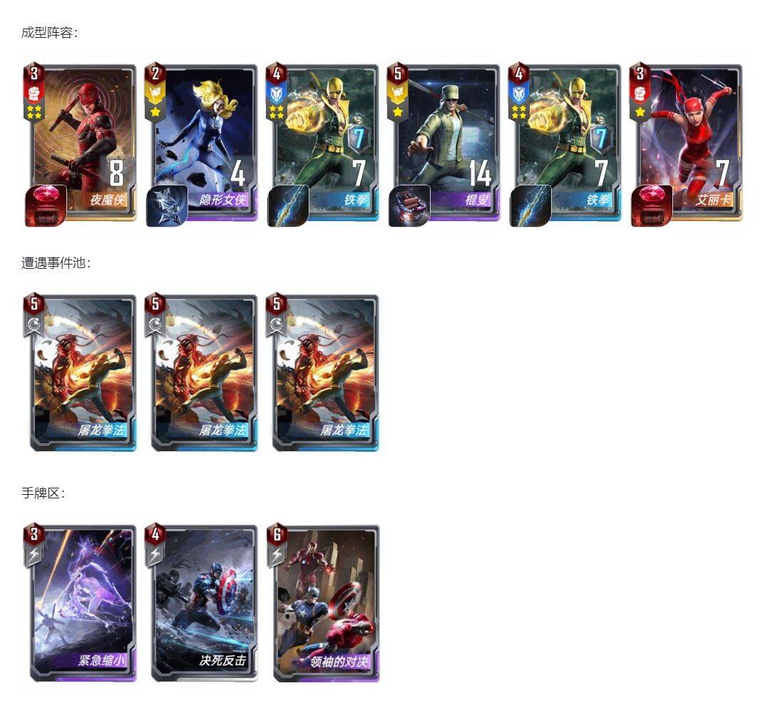 我愿称之为漫威第一神卡,建议合四张,无论哪个分段都能用到。血量充足不要一次性打太多,一张就够,卖卖血,便于链接启动;7血时可以一次打一张,防止对方破开7血;7血时也可以先加血,再连打3张缩小,苟住血【这张牌的使用是这套体系中最重要的,对局势的掌控决定了你的铁拳是速六还是吃分。】