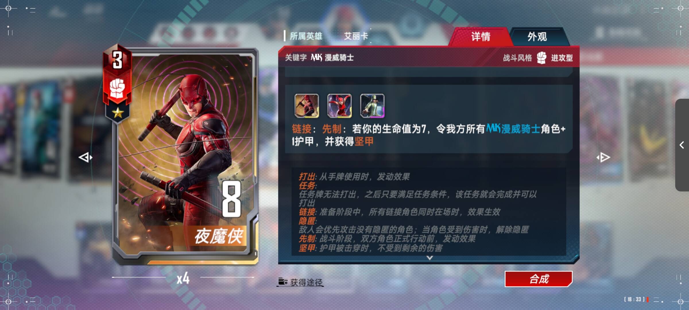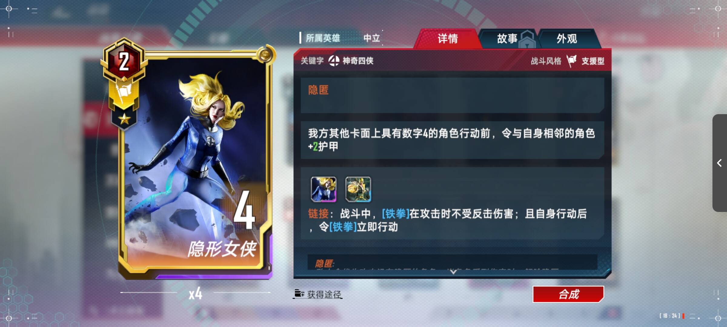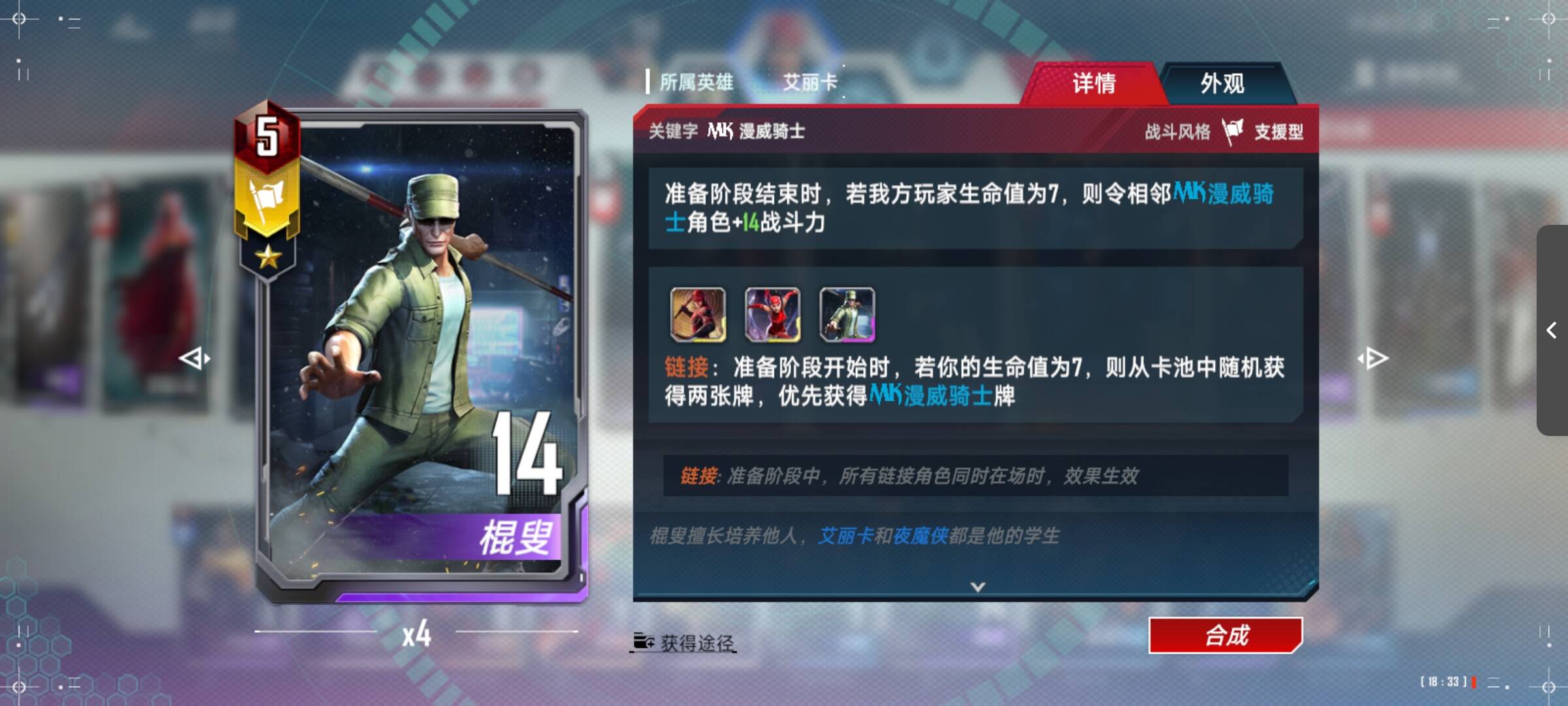 我愿称之为漫威第一神卡,建议合四张,无论哪个分段都能用到。血量充足不要一次性打太多,一张就够,卖卖血,便于链接启动;7血时可以一次打一张,防止对方破开7血;7血时也可以先加血,再连打3张缩小,苟住血【这张牌的使用是这套体系中最重要的,对局势的掌控决定了你的铁拳是速六还是吃分。】