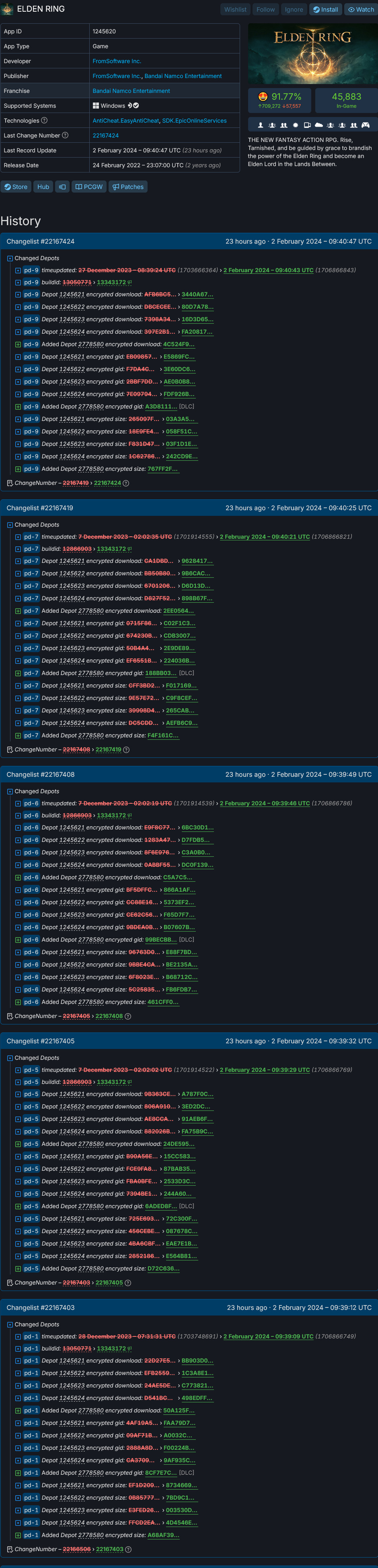 在过去一天里,带有“DLC”标签的条目被添加道《艾尔登法环》SteamDB 中的后台的多个类别中。根据 Steam 开发人员文件解释,FromSoftware 添加的“库(depot)”是将一组文件作为一个项目交付给用户的方式。像这样添加的“库”并不会立即在 Steam 上发布,不过可以将其分为特定类别,共开发人员查看和使用。