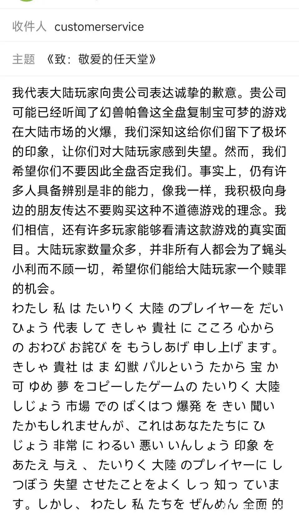 在《幻兽帕鲁》发售的第三天,一封声称写给任天堂的道歉信被分别发表在了幻兽帕鲁吧和孙笑川吧,内容谴责了《幻兽帕鲁》的抄袭行为,同时为该游戏在中国的火爆现象致歉。