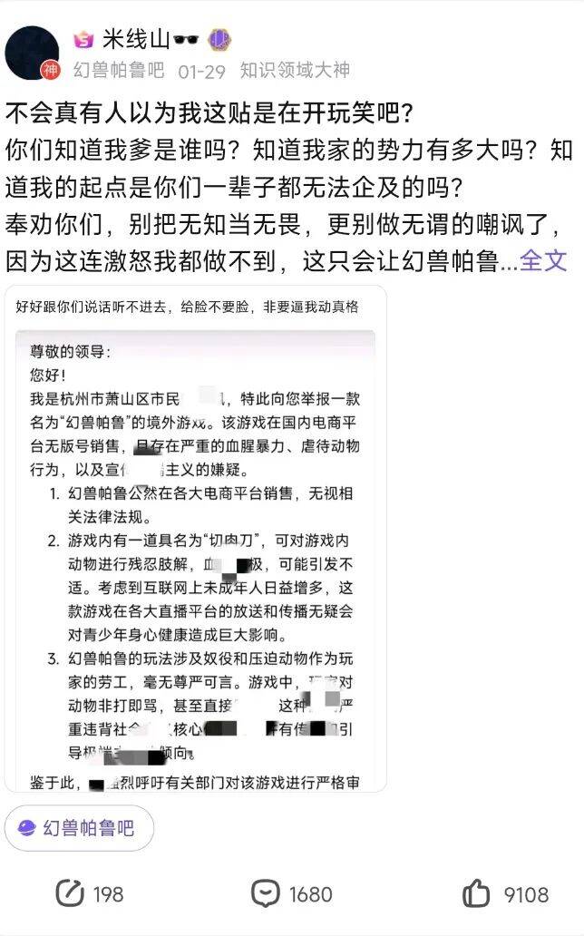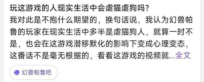 接下来的几天,他在幻兽帕鲁吧反复横跳,一会觉得《幻兽帕鲁》给任天堂上了一课,一会又说玩这游戏的都喜欢虐待动物。