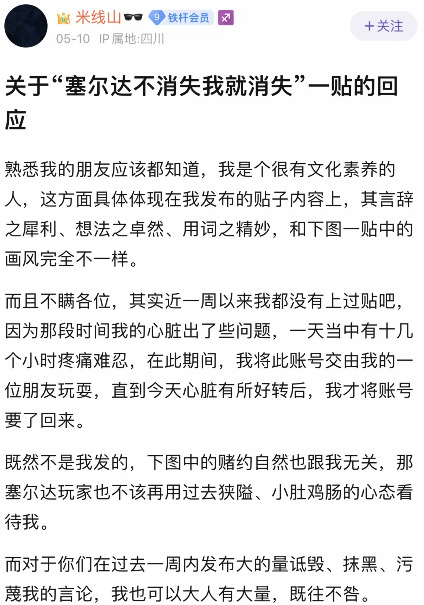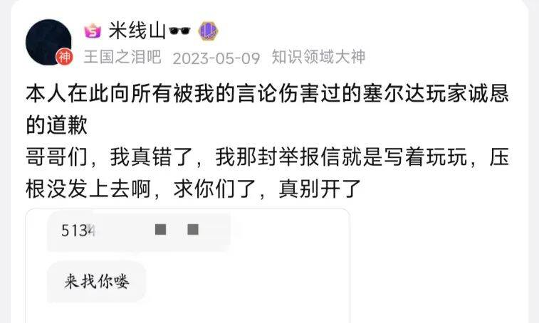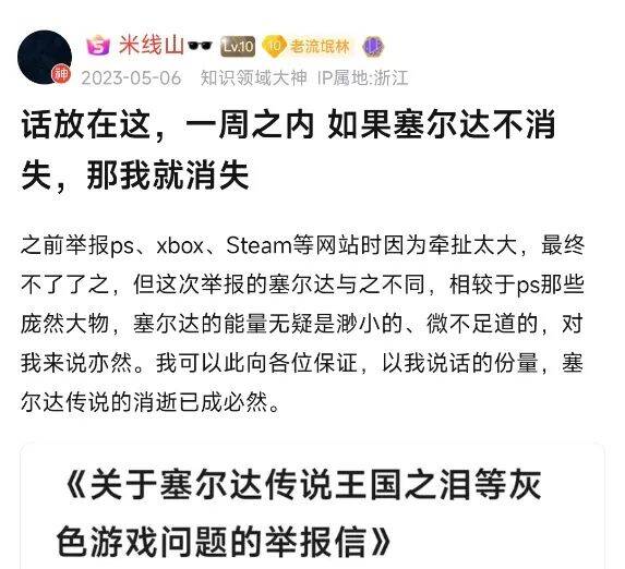 举报带来的流量明显让米线山看透了人类,毕竟不费一兵一卒,就能轻易将千万人的情感拿捏股掌间。在这之后有什么事他都要玩一手举报。王国之泪发售前夕有人偷跑,他这回倒是立场坚定的继续炮轰正版玩家,并利用举报制造争端。举报信发出后,他还紧接着放出狠话,“一周之内,如果塞尔达不消失,那我就消失”。