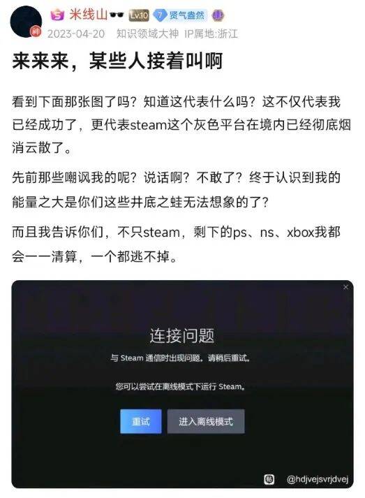 他也不忘为言辞留下供网友一拥而上的漏洞,自个网络问题登不上steam变成了举报成功最有力的证据,通信出现问题那便是steam烟消云散的悲惨下场,更告知吧友要开始对其他平台一一清算。