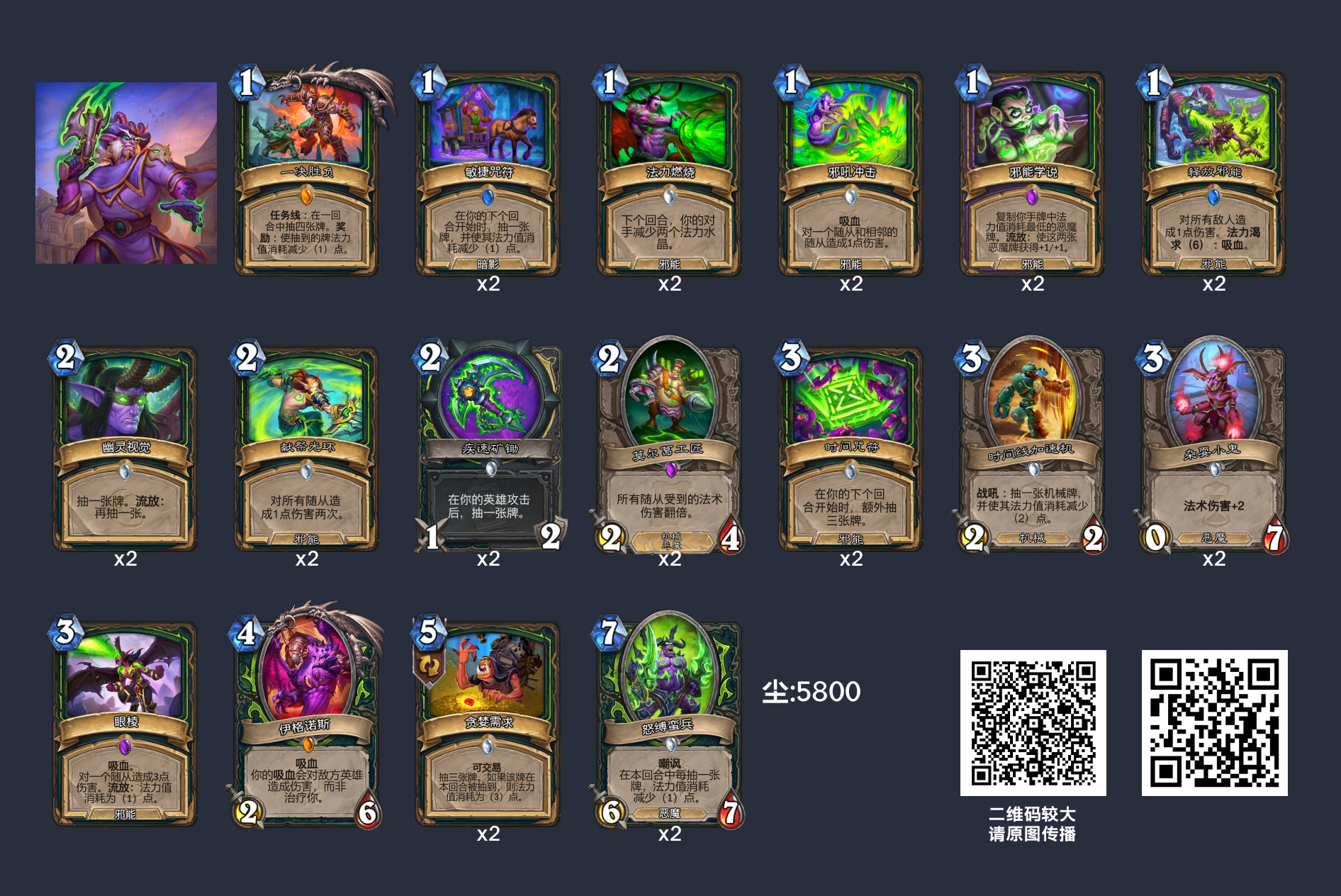 首先明确一个事实,这些卡组除了暗牧之外,其他的卡组几乎都不具备非终端之外的斩杀能力,也就是说,血量是十五点还是三十点,其实区别并不大,所以我大胆的去掉了亵渎,暗色炸弹,ak等解场牌,也就有了现在版本的构筑。