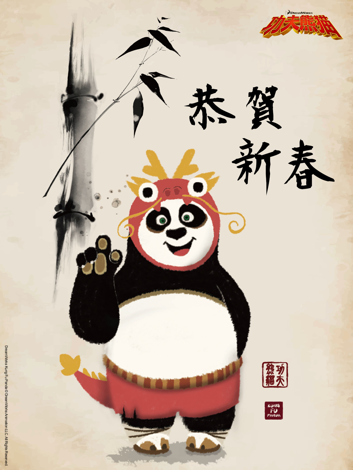 《功夫熊猫4》主创杰克·布莱克(献声阿宝)和奥卡菲娜(献声小真)来拜年,祝你龙年行大运: