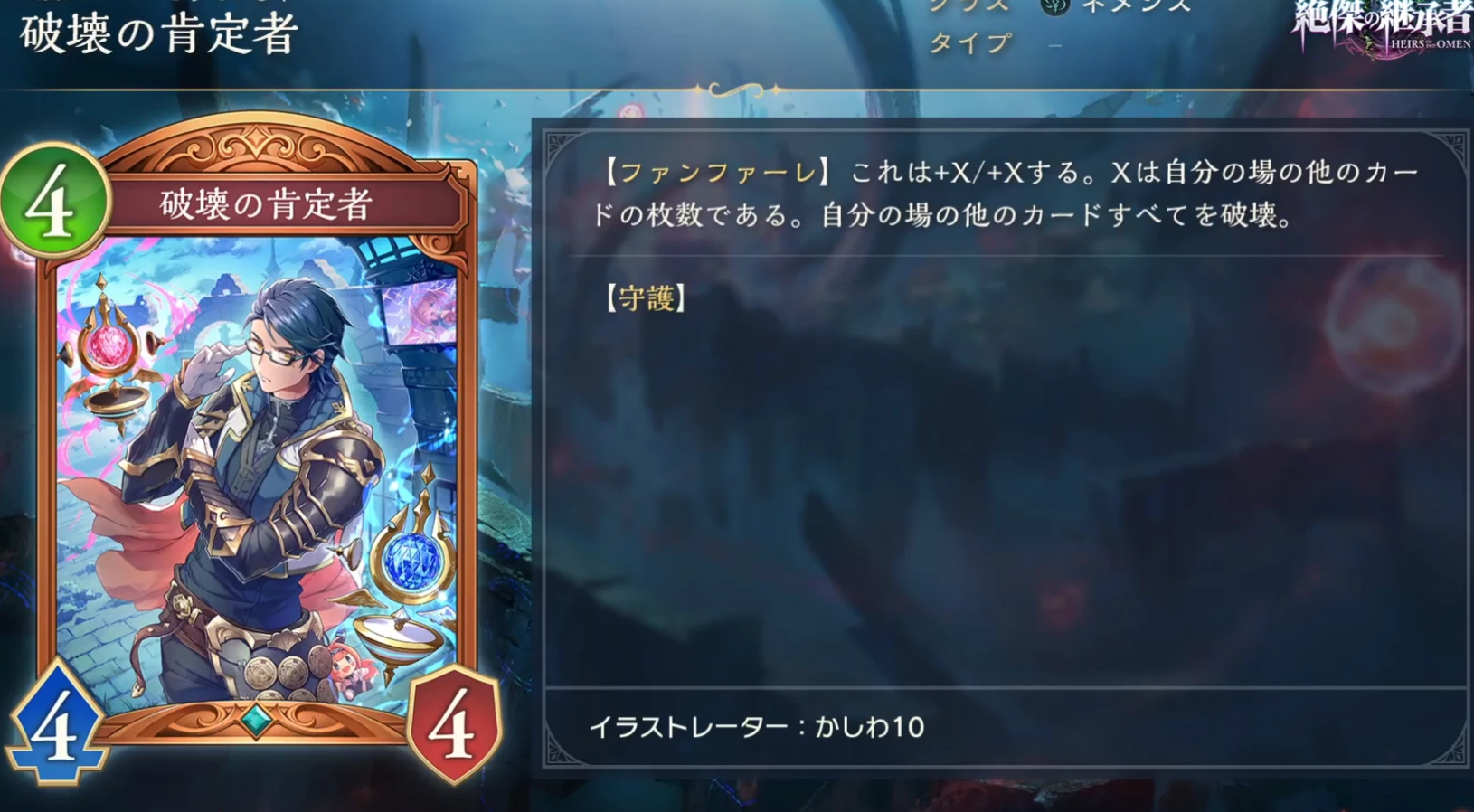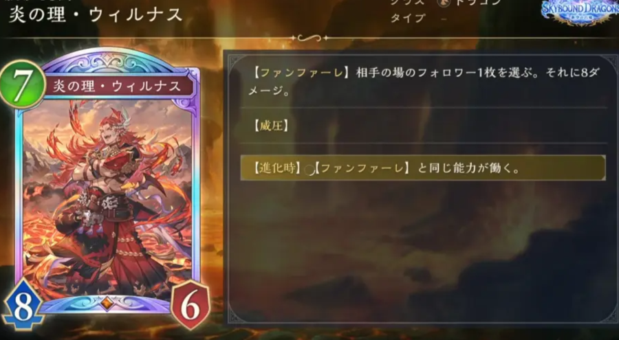 入场曲 给予敌方主战者和敌方随从全体5点伤害。如果「自己在这场对战中置入牌堆中的创造物随从卡数量」为20张以上,则会由原本的5点伤害转变为10点伤害。
