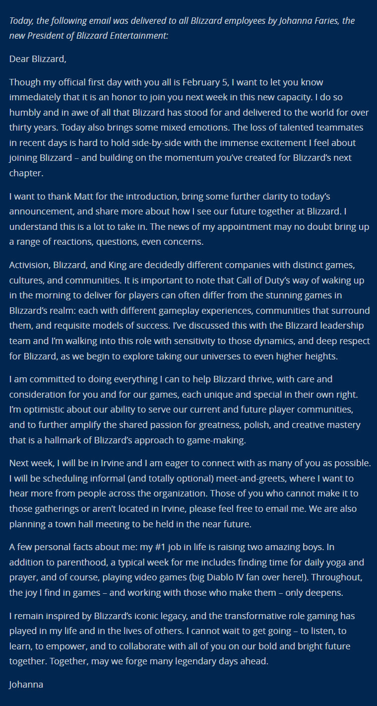 「我将尽我所能帮助暴雪成长,关心并考虑你们和我们的游戏,每款游戏都有其独特和特殊之处。我对我们服务当前和未来玩家社区的能力以及进一步放大暴雪制作游戏的伟大的、精益求精和创造性的热情感到乐观。」