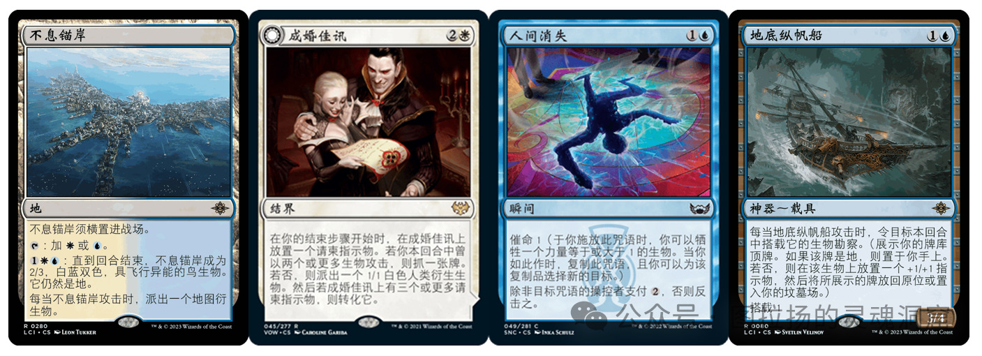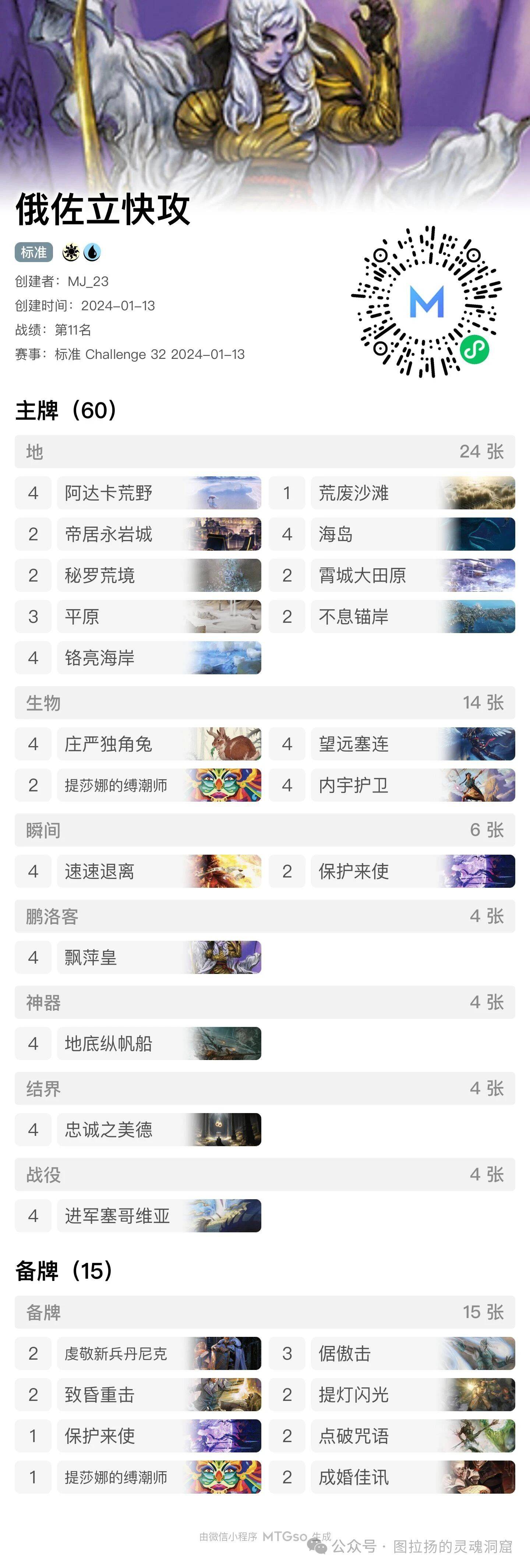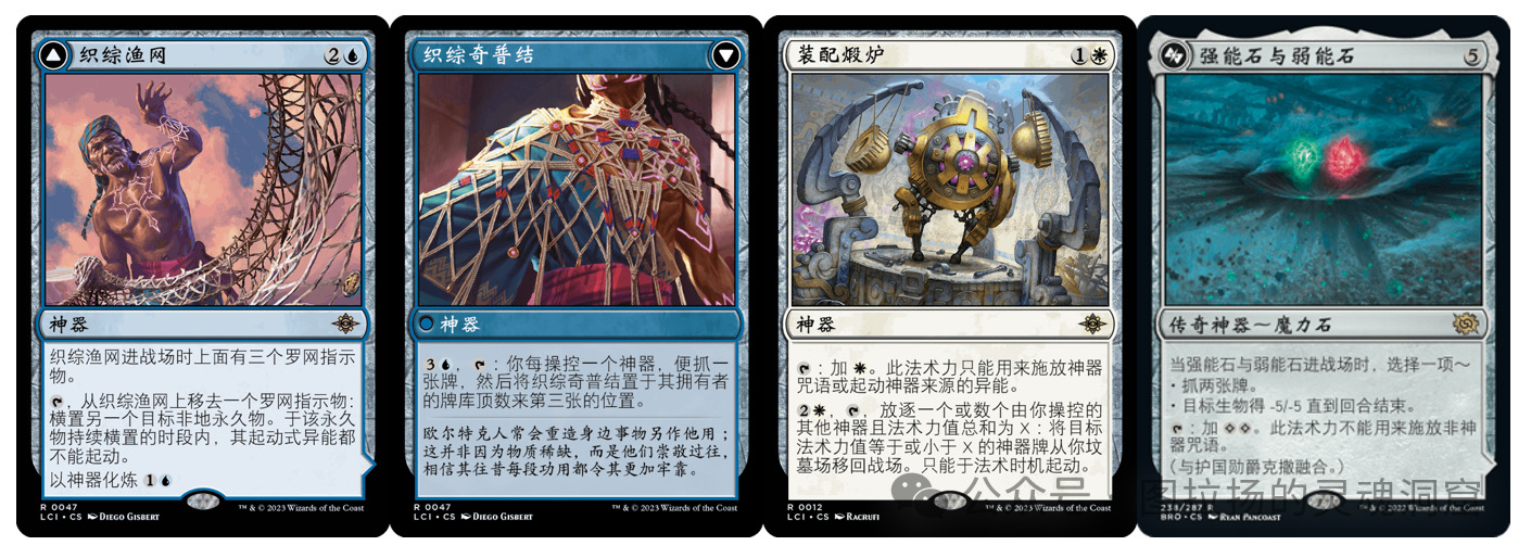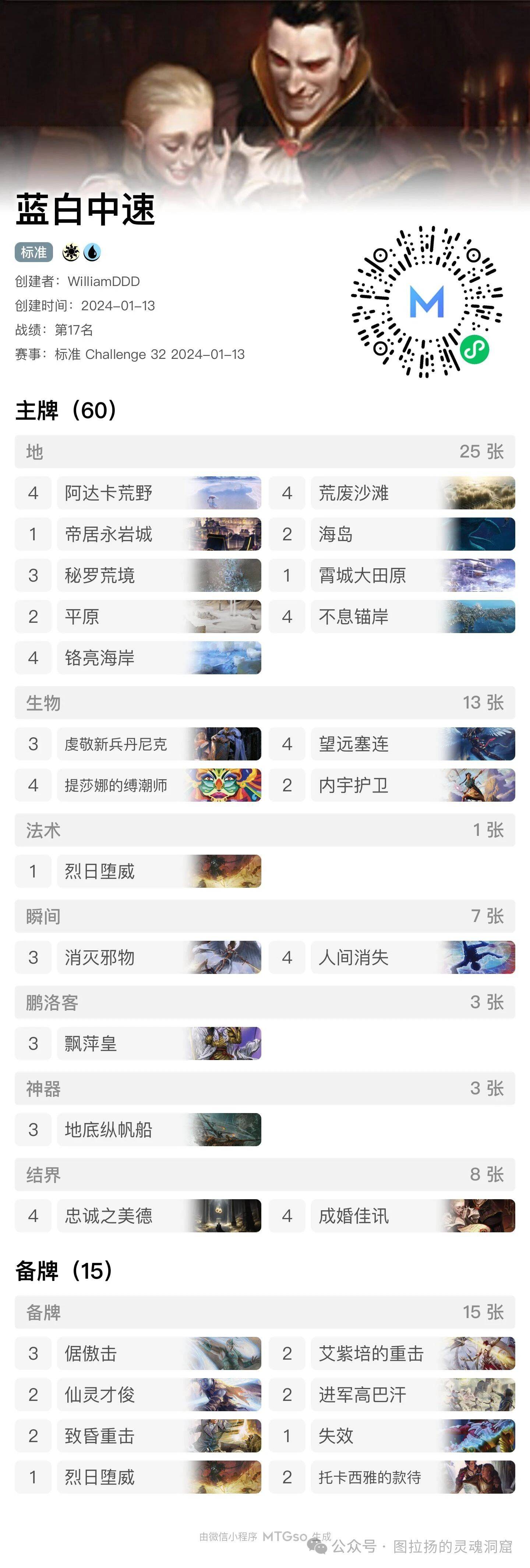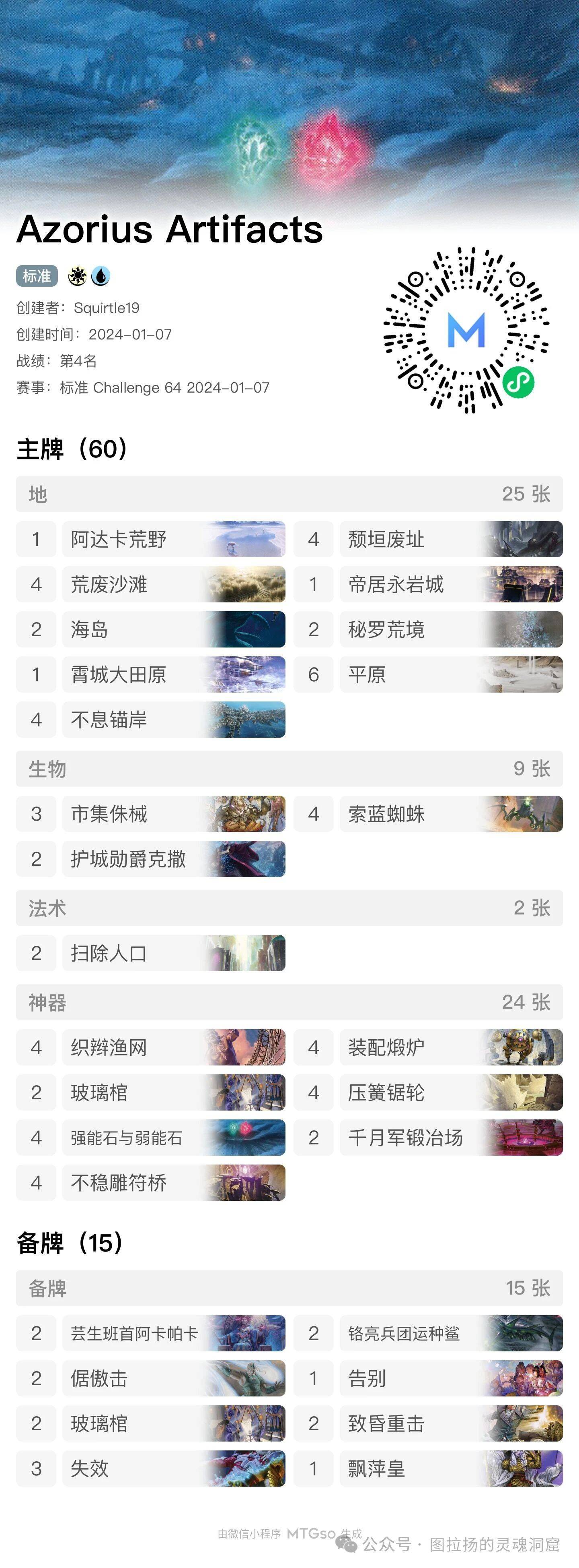 主白的神器底,蓝色为背面能抓很多牌的渔网和反击咒语。套牌中有神器思路专属且有其他功能的优质加速,让这套牌和上面的纯白混黑一样,完全不缺往后打的资源。