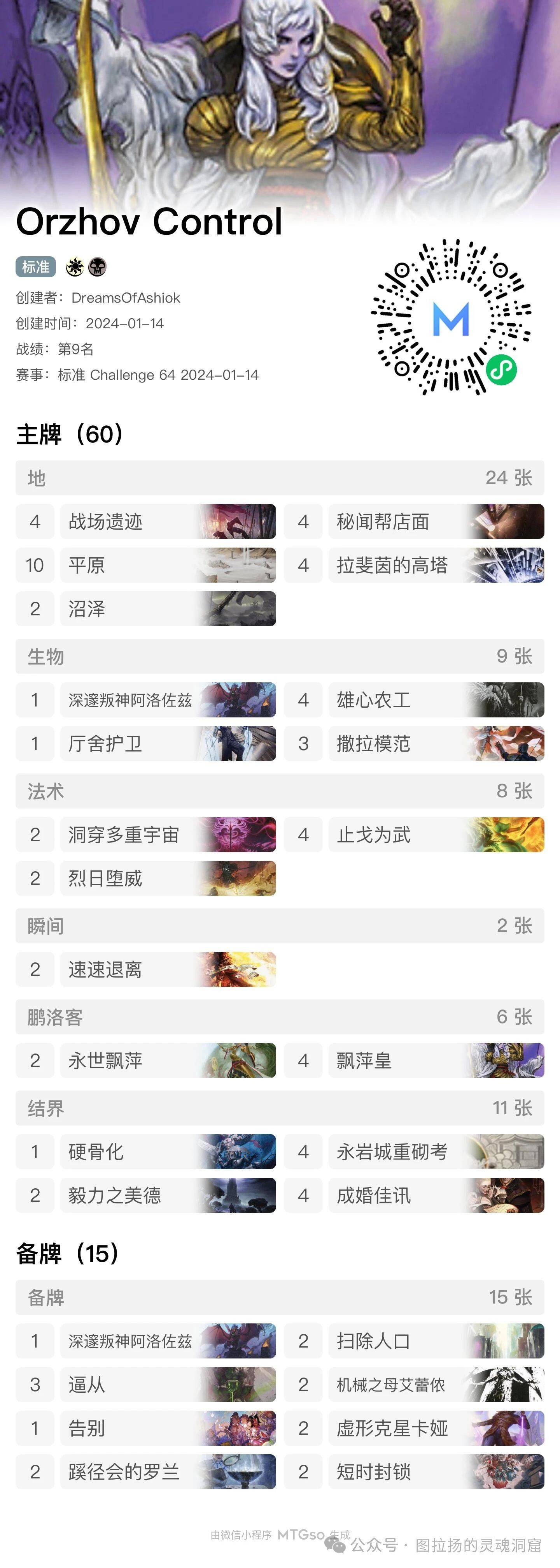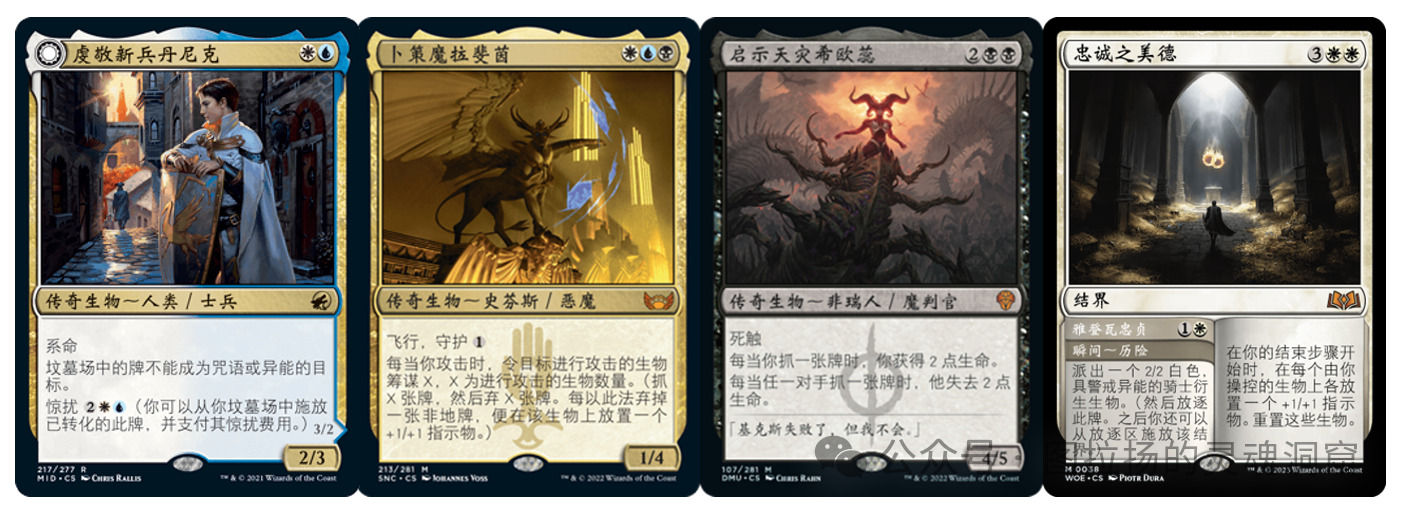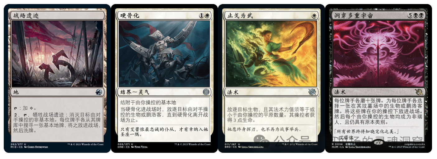 由于其大量的找基本地/战场遗迹类单卡,纯白可以轻松使用止戈为武和硬骨化这两个别人都用不顺手的去除,消耗能力极强,几乎每张牌都赚半张以上,相比于纯白,混黑后能使用的洞穿多重宇宙能提供一个更高效的致胜,备牌也能用逼从来弥补纯色缺失的维度。