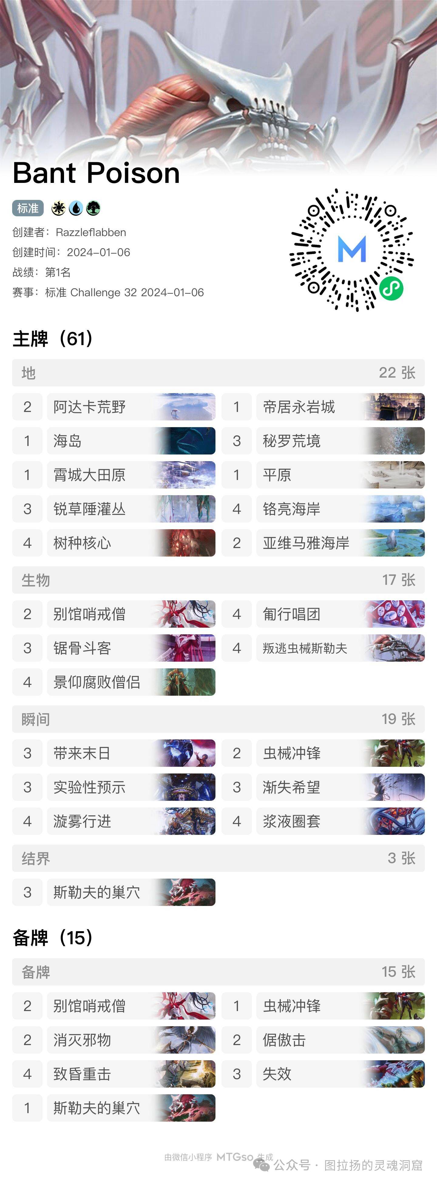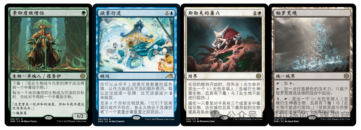 下毒快攻相当于一套变相的红烧,生物打血快,去除和互动咒语也相当于能打对面的血。本质是套白蓝,绿色是为了景仰腐败僧侣:下毒效率最高的生物,配合浓雾行进可以一下打很多血,且无法被去除和反击咒语干扰(甚至因为是复数个异能,人鱼都不怎么管用),除了人+互动的部分,还有个让很多套牌绝望的虫械花开作为另一个维度的威胁,这套牌的秘罗荒境也是用这个地的牌里最合适的。