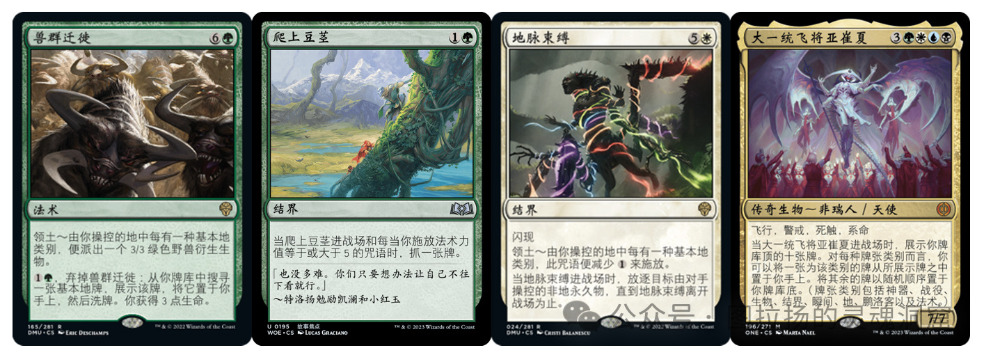 疯牛满地跑又能回血找地还能当致胜,能帮助这牌顺畅的下地调色到中期,豆茎+地脉束缚的组合也在充当这个角色,等到大飞老师出场并结算的回合,大多数套牌已经无力与之对抗了。