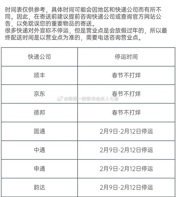 其上显示,圆通、中通、申通和韵达将于2月9日(除夕)-2月12日(大年初三)停运。