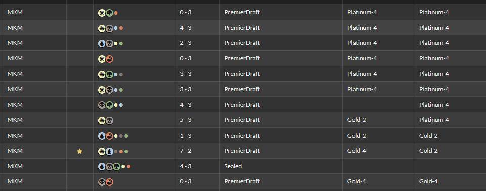 大家好,我是木木。本人mtga伪开服玩家,专门游玩真人轮抓,近3年每个系列发售首月或第二个月都能打到密稀拿到20pp排名的水平,均胜率约4胜,每个系列大概能打到80%全卡,然后仅看货币收益净亏个3000-5000钻,虽然和能在mo卷比赛,ma卷现金赛的大佬们还有很大差距(我的最佳水平也就是ma现金赛1票过day1,2胜倒在day2),个人认为姑且也可以勉强算的上ma的top玩家。在本系列上线前我花了大概2周时间对每张牌,每个色组应该怎么打,什么曲线用什么牌都进行了一定的分析,可以说在我整个mtga游戏过程**课做得最多的一次(上一次是bro环境,然后现金赛day1打了7-8个pod被各路炸弹连番轰炸直接金币清零),但mkm的限制赛比赛,把我对万智牌(算了还是说mtga吧)的一切认知砸了个粉碎,先上这三天的成绩截图如下。