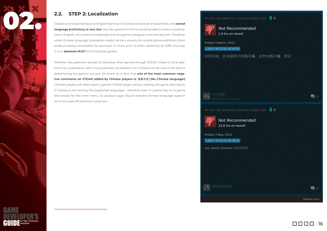 此外中国英语水平处于较低水准。因此中国玩家在Steam上最常见的差评之一就是:没有中文。 中国玩家对于没有中文的游戏,通常不阅读游戏商店页面内容就离开了,所以游戏必须要支持中文。而且大多数中国玩家使用简体中文,所以要优先考虑游戏本地化为简体中文。
