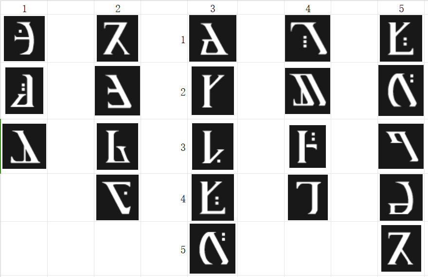 可以看到,第3圈和第5圈,第5圈和第2圈已经有连接的符号了。之后,通过排除法可以得到第二圈最后一个连接的不是十分清晰的符号,应该是第4圈的第一个符号。最后加上第1圈可以得到完整的符号排列顺序。
