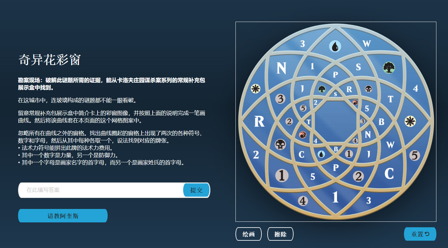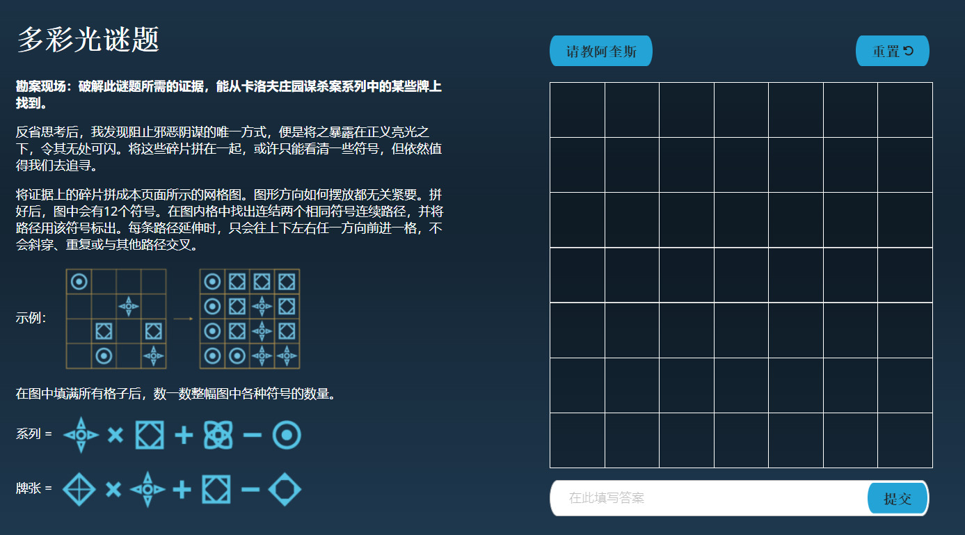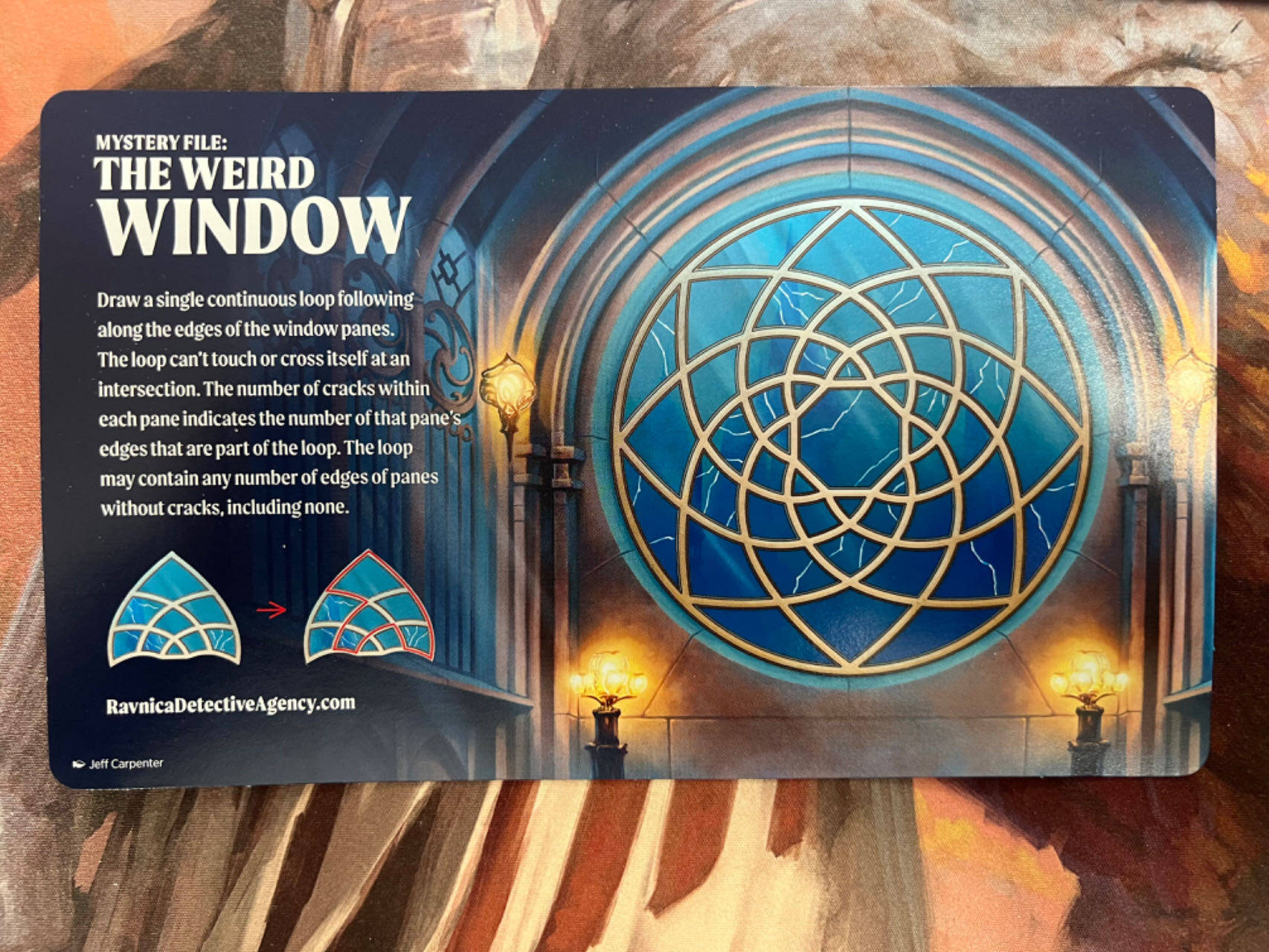 本系列常规补充包盒内的介绍卡上附有本案的谜题,需要根据说明完成一笔画,其中每块玻璃上的裂缝表明了经过该块玻璃的线的数量,且所有线不能相交。
