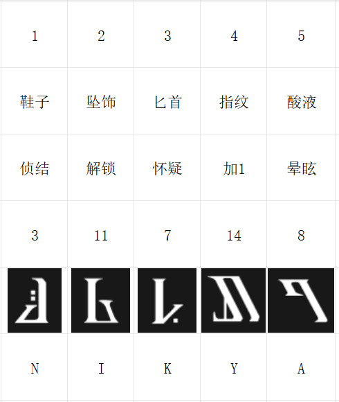 在线索正面的背景叙述中,分别出现了“plus one”“case solved”“suspected”“stun”“unlock”的字样,正好对应了5个指示物。于是可以得到画面上的五个数字14、3、7、8、11。