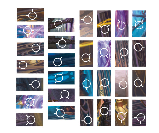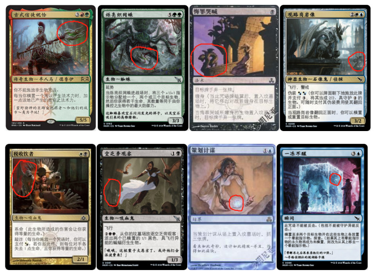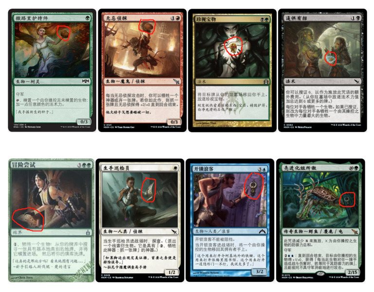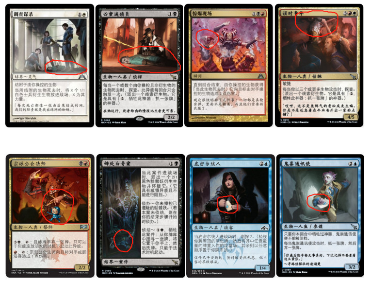 本系列一共有8张卡牌的普通闪卡与平卡相比会出现特殊记号,均出现在卡图含有由方格构成的几何图形上,如下所示。