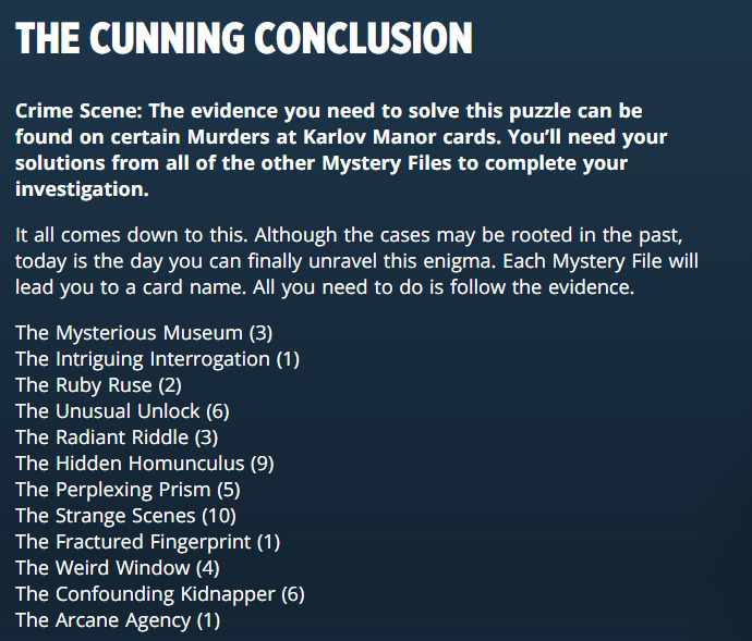 本次之前12个案子的谜底都是牌名,但是 正如案件所说,都已经是陈年**,而要追随“证据”,才能找出答案。这些“证据”就是这12张牌中的某些物品,他们无一例外地都出现在了本系列中,某些朋友已经出现在了我们的故事中。他们是: