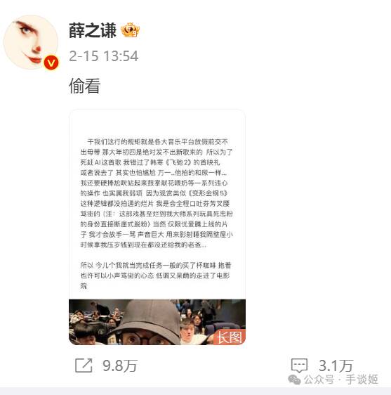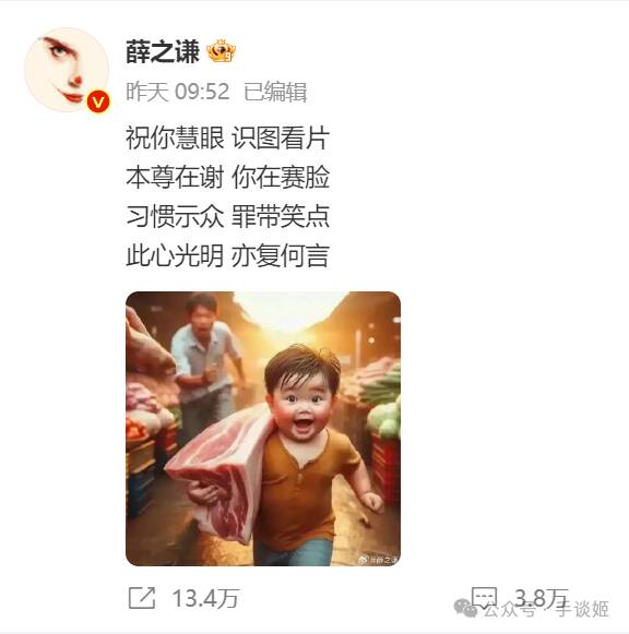 接着昨天一早,薛之谦又发文配了一个ai图片,普遍认为意思是《飞驰人生》电影团队“本尊”都还得表示感谢呢,这些影迷却要跳脸。
