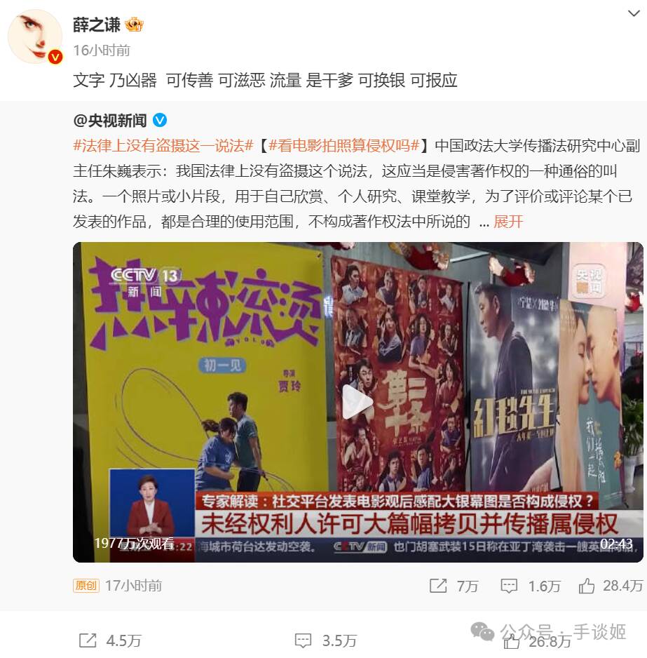 随后晚间,薛之谦又转发了“央视新闻”的“法律上没有盗摄这一说法”为tag的视频,视频基于侵犯著作权的角度对合理使用和侵权进行辨析。