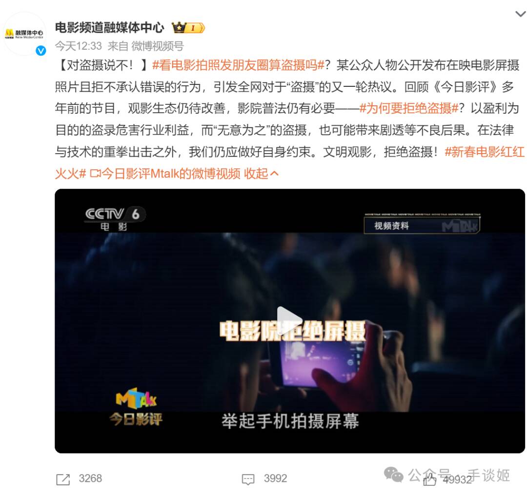 有趣的是,不同所属部门的“CCTV6 今日影评”却对此事作出了完全不同的评价,呼吁要进行自我约束,拒绝盗摄。
