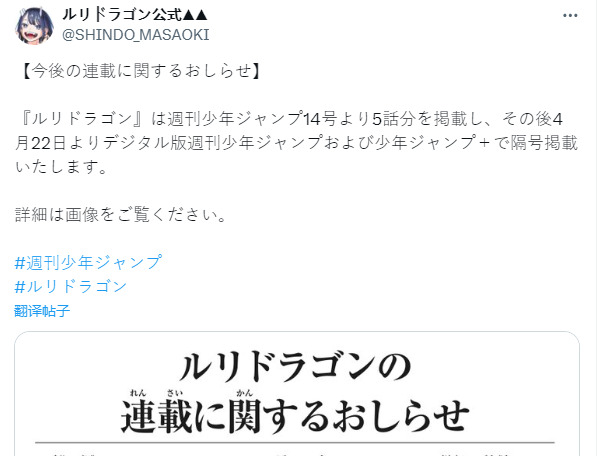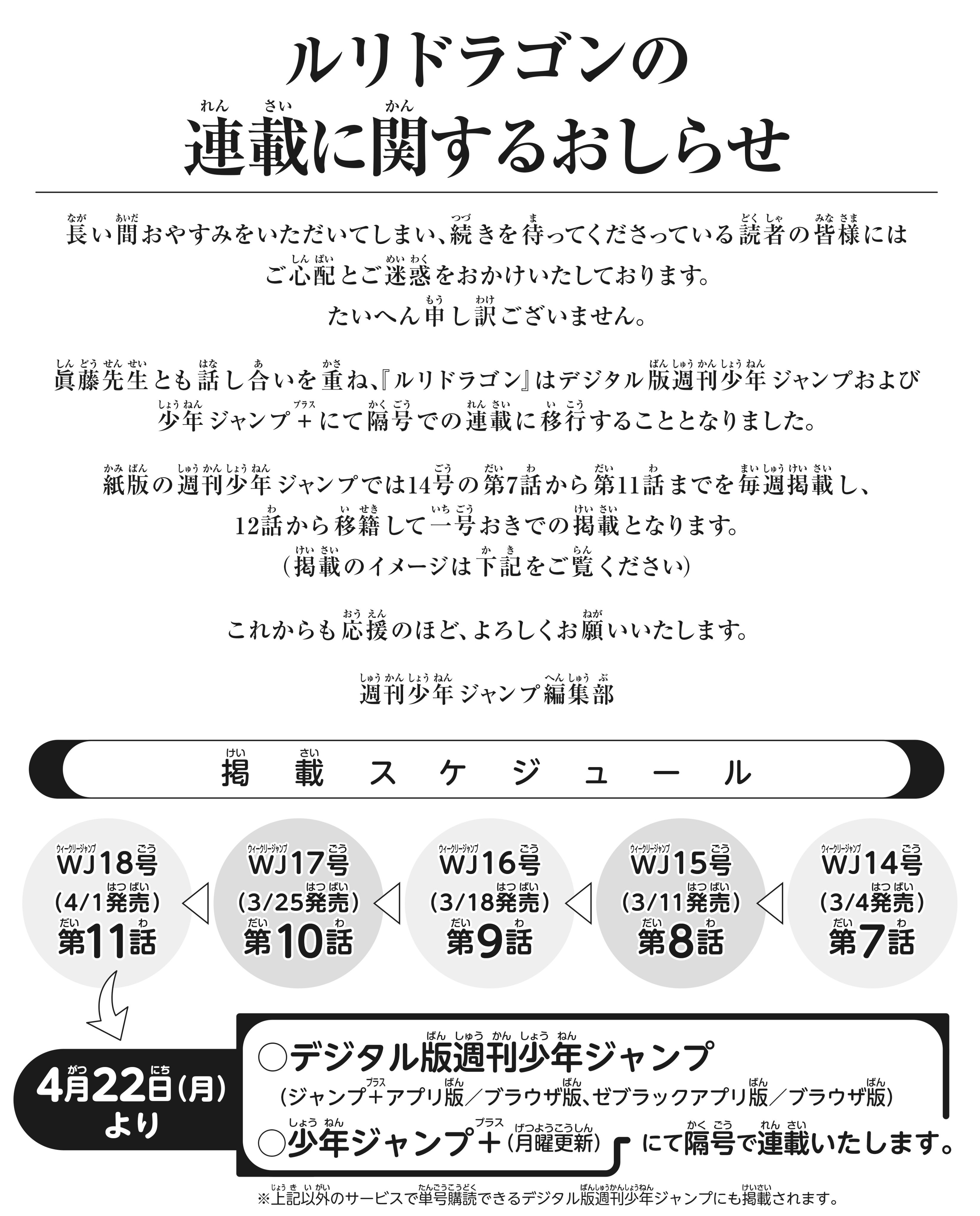 随后官方又于近日正式公布消息,《琉璃龙龙》将于3月正式复刊,率先在《周刊少年Jump》的实体版中连载第7至第11话,并将在4月22日后转移到《周刊少年Jump》数字版和《Jump +》上交叉连载。