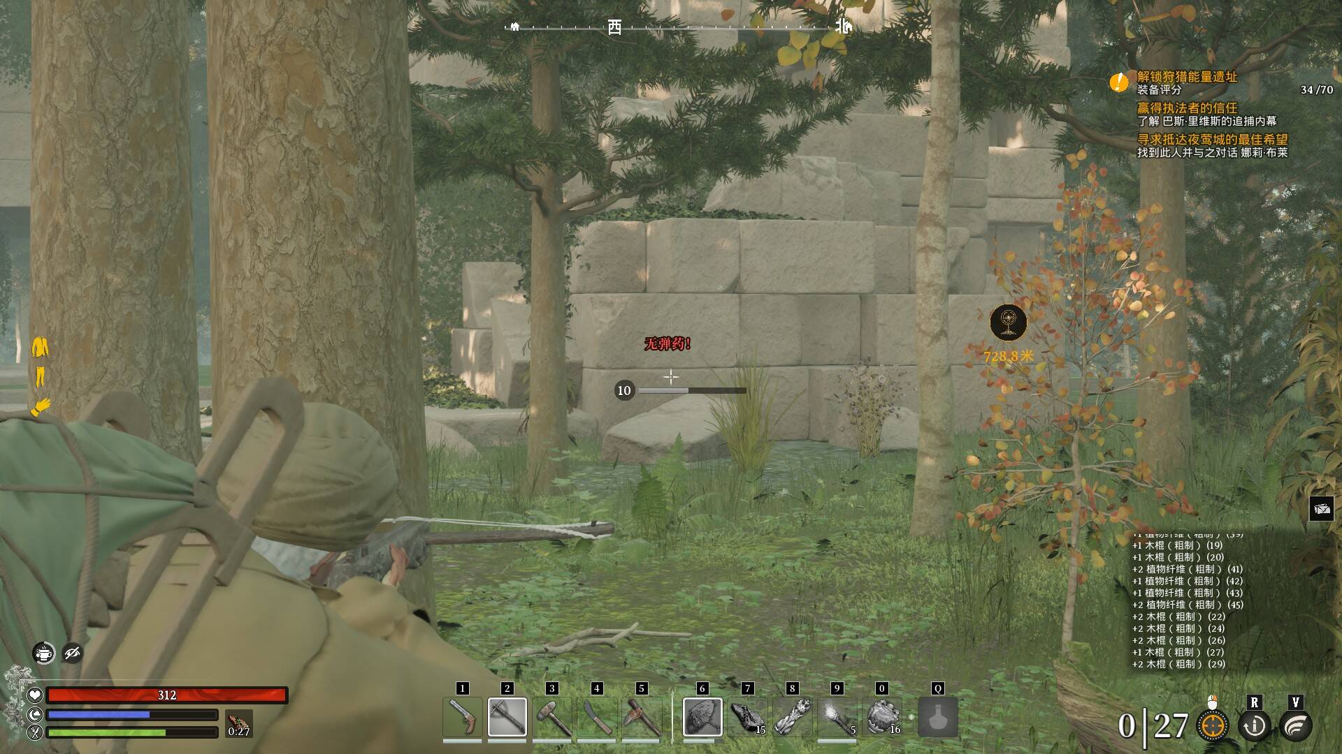 最后补充一下:如果用弩,第三人称,大致还是瞄这么个位置,动画播放有弹丸发射和下坠的过程,但实际判定似乎并没有子弹下坠