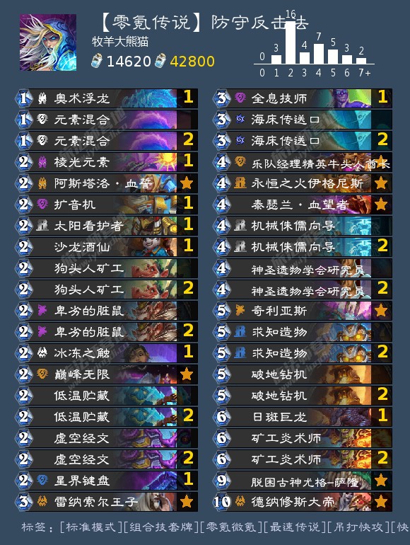 法师零氪自研卡组,从我去年8月份起玩,新手50级不断优化,卡包开出什么牌,系统送什么牌就去组合试试。终于在12月和2月靠吃DK和各种快攻冲上传说,对阵后期卡组也很亮眼,目前最强的铜须TNT战,对战胜率我自己感觉在45%左右(10回合下8费血誓吼2次毁天灭地啊,关键他能出4张,4张啊!还下酒仙!做个人吧),除此外牧师小德法师内战都不虚。首先要注意到一点就是,本卡组多是 发现牌和随机牌,所以能打出非常多combo和变招,对熟练度要求高,需要你多熟悉。对阵不同职业,起手和找牌都有不同。【打法思路-用卡差怼死他们!】40张牌意味着没法打出太特定的combo,一切看发牌员,所以我塞了近20张1费2费牌,这样起手就打出优势或者不让对面滚雪球。发现几张清场牌+求知造物 清场几次,对面就虚了。再用卡差怼死对面就炸了。再搭配上现在强力的挖掘体系,可以提供各种超模的清场站场回复效果。几张发掘牌都挺好用。很多朋友不看好6费炎术士,应该是手牌少了。这卡组一大优势就是牌超多,只要局势允许,一张能变出10张。搭配2费扩音机,6费下去最多能打出11点伤害(我宣布血誓人称小炎术士)。刷牌也能刷出发掘牌,每把能刷到2次4费橙,有时到3次,搭配酒仙,4张随机职业1费泰坦橙,就问你怕不怕?酒仙+神圣研究员是我很喜欢的组合,10费4+2+4,4个法师奥秘,慢慢猜去吧😃。众所周知,法师还专门有个奥秘法。但是奥秘占卡组不说,还容易被对面1费0费牌骗。本卡组奥秘突出一个量大管饱,5费用虚空经文刷出2个反制,锻造机器人,法师泰坦也有。发现也出,这样奥秘就廉价了,不怕浪费。对面几回合防下来,节奏也没了,要是防到铜须奥丁什么的,对面光头直接炸😁【本卡组不缺牌,所以没过牌】唯2张过牌「海床传送口-3费 抽1张机械牌然后手中机械牌减1费」,最早是为解决抽不到求知造物的问题(打快攻),发掘钻机也是机械,机械多这张抽牌就值。【DK-82开】DK目前就疫病和脚本快攻两种,疫病可以打到91开,首先是回血猛,太阳守护者、奇利亚、锻造橙武、日斑龙,德大帝。还有各种随机牌回血+护甲,发掘也能比较稳定的出回血元素或者343圣盾突袭吸血,不怕你钝刀子割肉。如果抽到**下清洗,你连刀子都没了。新出重生Dk不要怕,两次清场就没了,不够就三四🖐🏻次,不差牌~~脚本快攻73开,主要是怕对面天胡,顺便说句,现在造物被砍了,群伤不容易堆了。Dk铺场+buff直接突脸,一点法都没。我牌刷出群伤要回合,很怕这种5 6回合叫杀的,不是没法针对,是刷牌随机性高,你没刷到清场那对不起,我胡了突脸,你随意。除此外DK憋想赢,多给一分是因为打出感情了😭上分基本就靠他。【机械贼—64开】现在快攻宠儿就贼和Dk了,骑/术/德削的🐴都不认识了。遇到贼和Dk,我起手只留1 2费牌,3费都换,要比快攻更快!这里提一下334「全息技师 随从受到1点伤害,便被消灭」,这牌是我想到比较廉价的解牌了,5费配合火铳灭1个贼的组合怪,或者法师有个1费造成1点伤害的法术,能灭隐藏中的机械,我没带是遇到贼少,而且这combo比较难凑,朋友们根据自己需要调整。【战士—55开】天梯现在一半是战士,战士又基本是铜须TNT战了。对付他核心就是搞掉铜须,我准备了脏鼠和奥秘反制随从,这就比较看脸了。我这套先前是可以硬钢奥丁战到73开,但对面下铜须+血誓是真的没一点法,战士清场也多,我橙武堆甲最多也就能抗3波😭【术士—73开】术士发掘,淤泥接连挨刀,很好打,等到清洗机一下基本就炸了,其他卡组,快攻刷清场牌,阴间刷解牌。【骑—64开】骑士挨刀后强度也下来了,前期要站场或清场,留解牌对付那两张职业橙。【牧—82开】牧师大体是吊打,主要预防一手暗牧和机械牧,不同种类区别挺大的。机械牧2手脏鼠+酒仙,或者刷到群体沉默对面就无,暗牧就对付快攻的方法,站场清场预防对面滚雪球。暗师抢血能力上限低于Dk,但胜在能持续好几波打出高伤。主流牧师就好打了,随从弱,法术强。场上随从保持压制就行,几次清场打出来牌就空了,刷出来法师8费魔像和7费元素都是很强力召唤随从牌。【法—64开】只有西芙法有威胁,就看脏鼠能不能拉出来了。【德—73开】亡语德挨刀,基本没了,龙德强度下降,就嘲讽复制龙早下会有点威胁。【萨—82开】小心彼界萨,有点阴间,不过好在要89费才能展开,我卡组好几次78费就抢死牧师萨满了。除此外多挂奥秘,刷Dk那个4费法术 冰冷监狱或者萨的呱(虾仁还要猪心,好可怕啊:-D)对付亡语随从敲好用哒。【瞎—要不,删了吧。。】总结一下,本卡组核心思想就是刷牌,减费,用超模卡砸碎对面,需要朋友们多多练习。最后祝大家包包出橙卡,月月上传说!