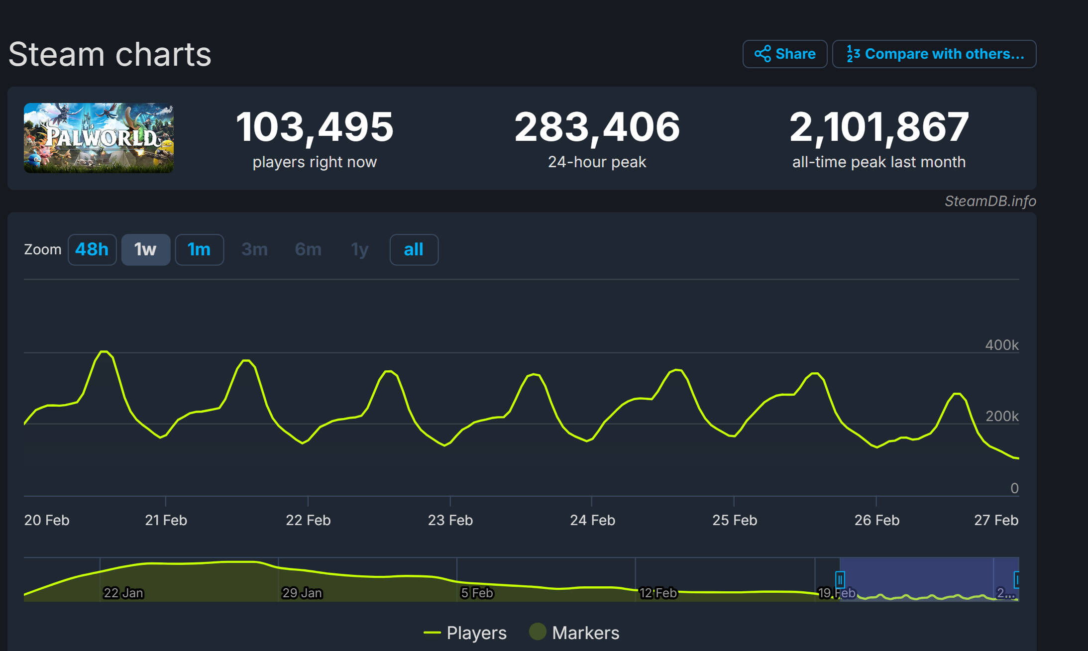 不过随着时间的推移,《幻兽帕鲁》的吸引力在消退。据SteamDB,《幻兽帕鲁》在发售仅仅一个月后流失了84%的玩家。该作当前在线10万人左右,24小时峰值28.3万。和当初的巅峰在线相比,可以明显看到《幻兽帕鲁》大势已去,正所谓“来的快去的也快”。