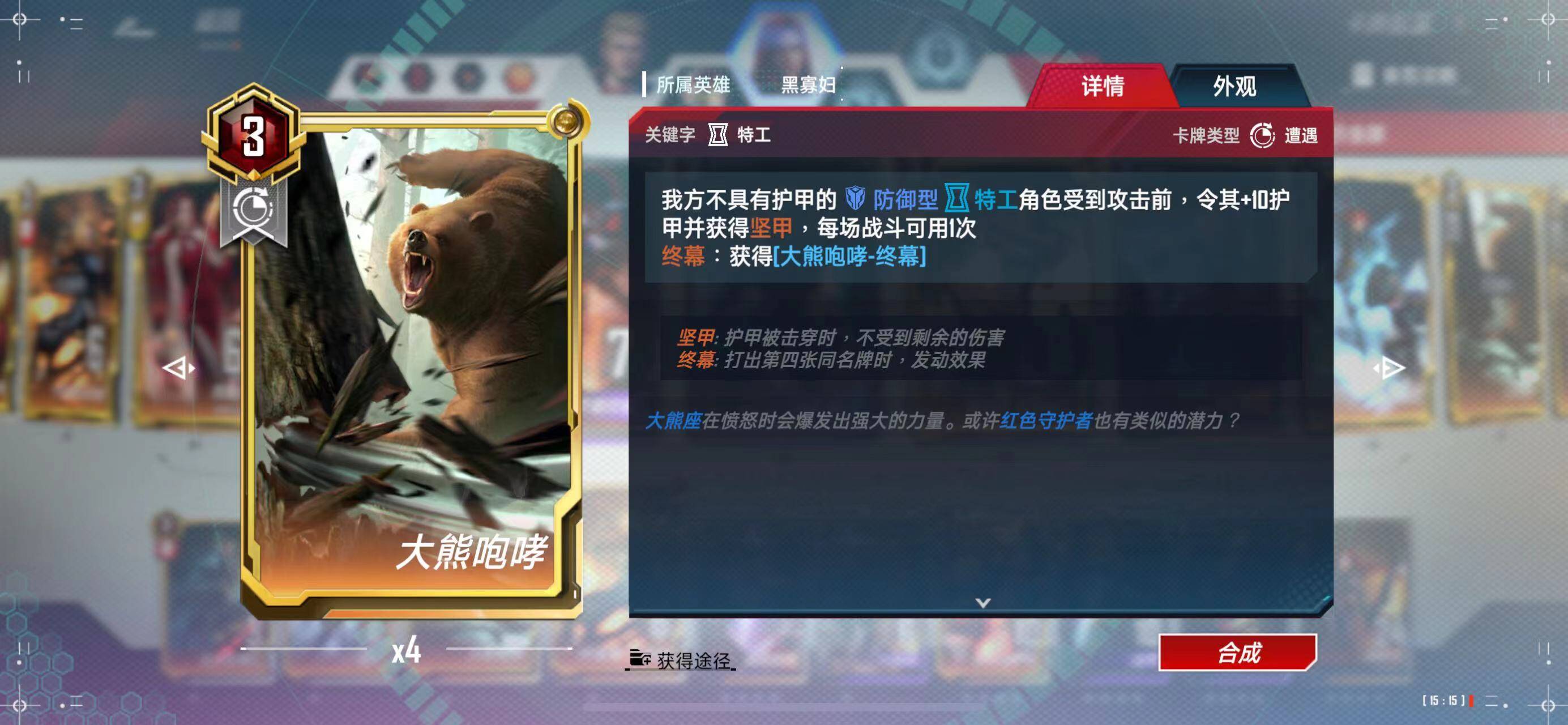 大熊咆哮我只带 了一张,因为手牌实在太满了,而且遭遇区和手牌数的关系,也没机会让玩家打出四张大熊咆哮获得终幕。