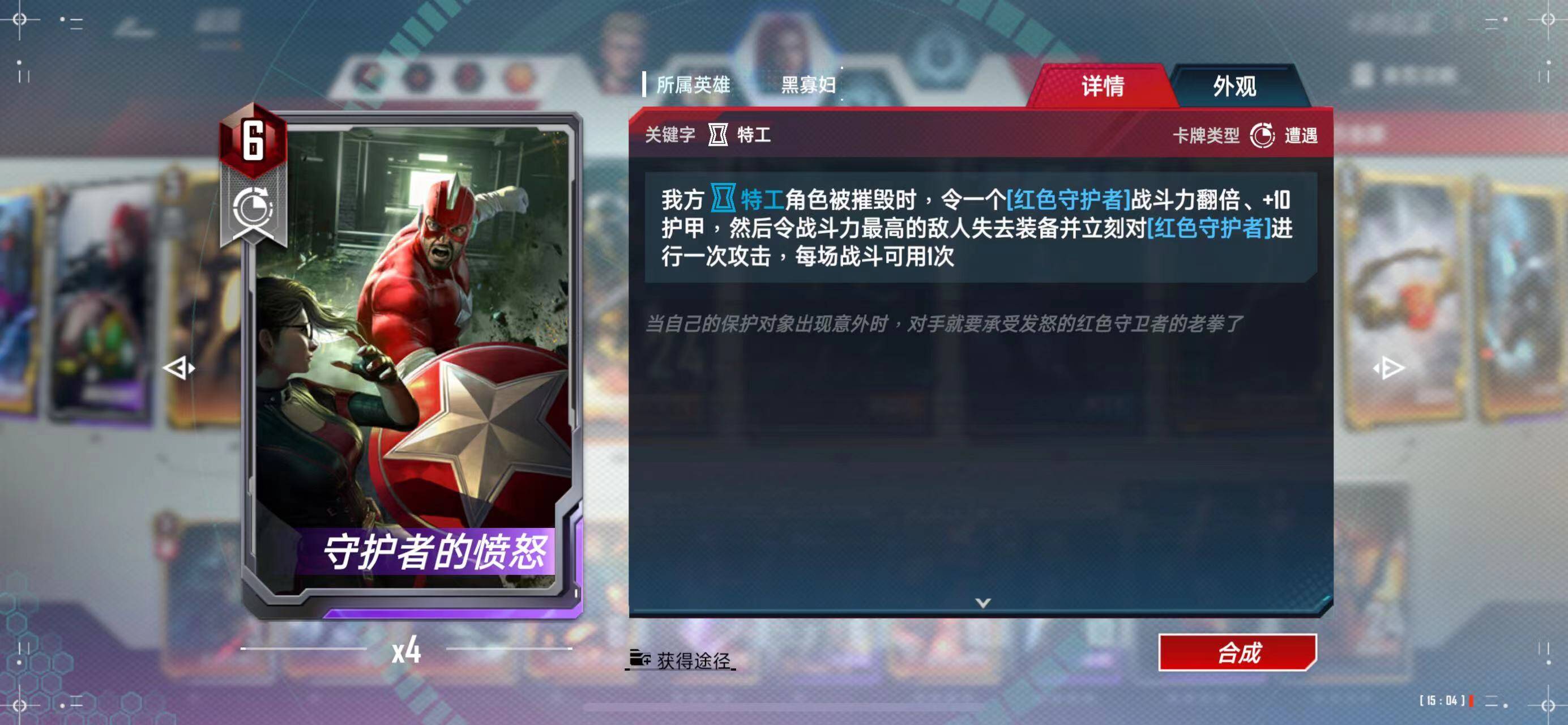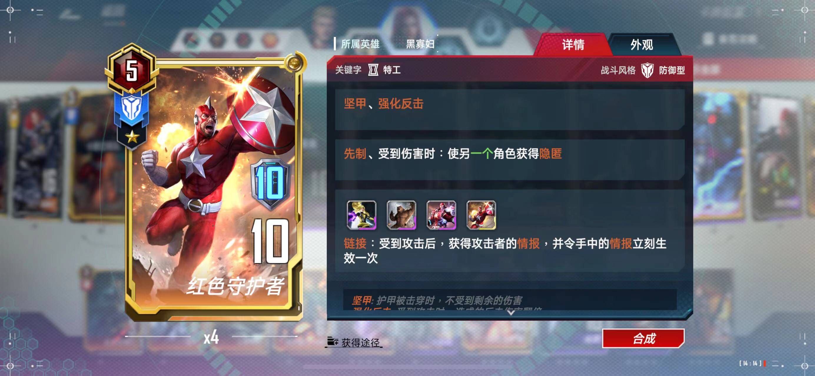 守护者的愤怒:我方死特工,坚甲红卫立刻加护甲、挨打,重复获得、触发情报,对方减攻击,我放加攻击。性价比很高。