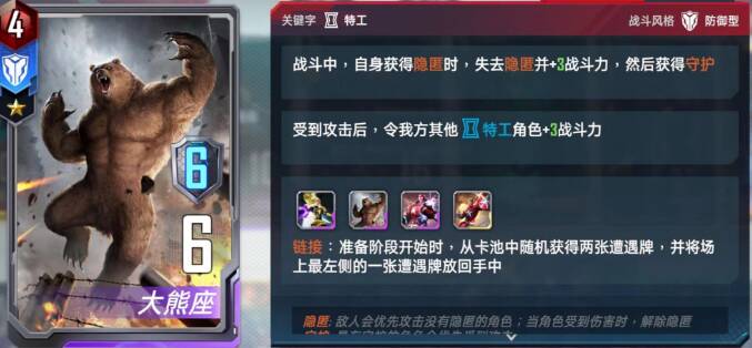 关于大熊座,我只带一张,毕竟需要红色守护者挨打,来重复触发情报来针对大身材的敌方核心。