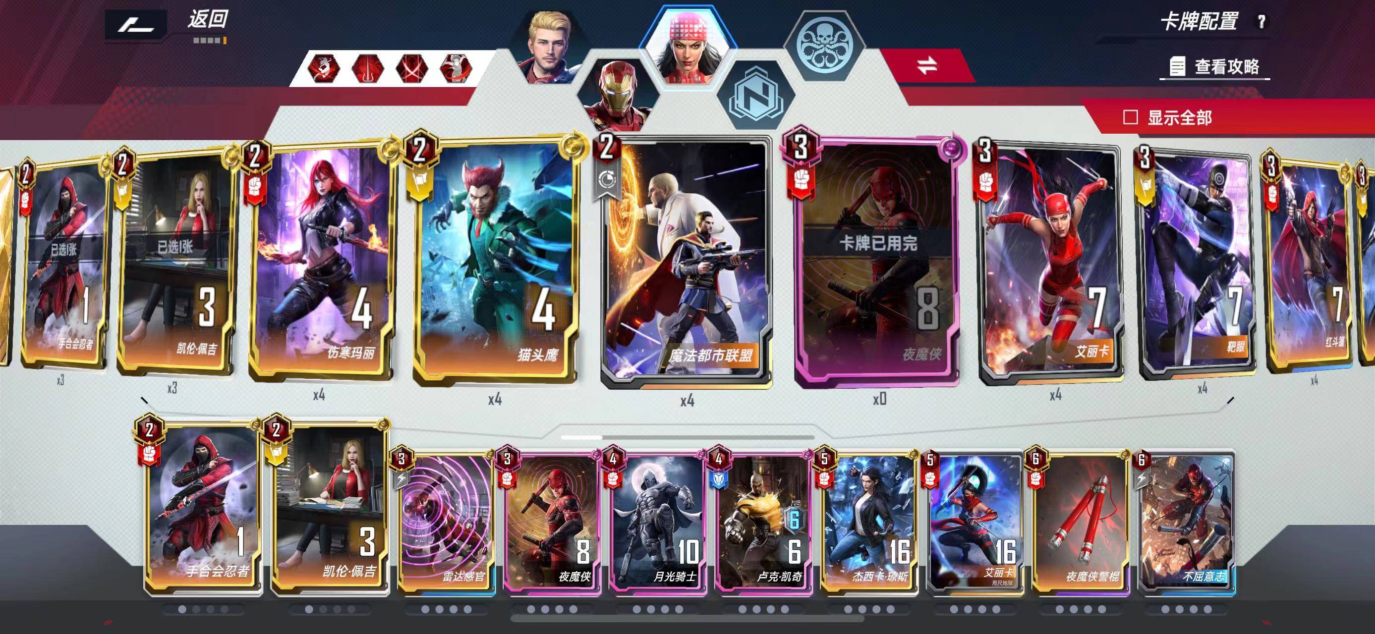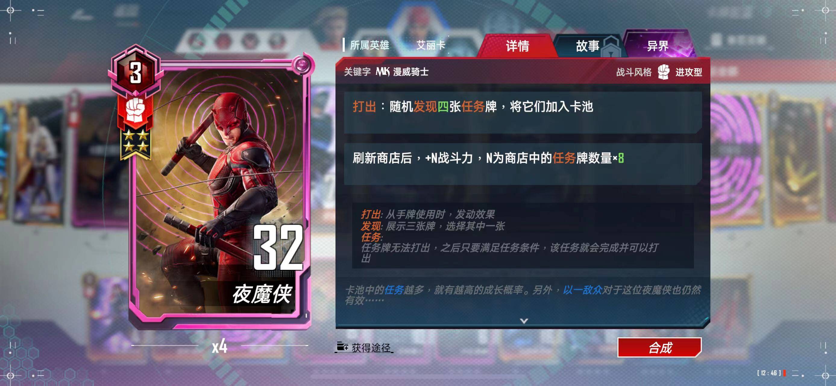 这个基本是固定的了,注意夜魔侠下面的小字,夜魔侠可以吃到以一敌众,而发现的任务里面也是有以一敌众的,建议选到4张,但是我们前期是不做的,还有就是前期建议多选几个不同的任务。