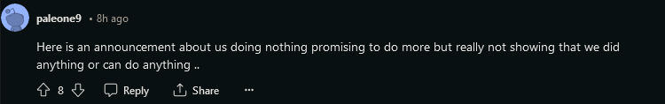 但是公告有一些地方依然非常模糊,例如《背水一战:诸神黄昏》已经在 Steam 上抢先体验了 2 年多,那么 3 月的“重新发布”到底是什么?而曾经有期待的粉丝对于《卡米洛:解放》模糊的发布时间也不抱太多希望:在经历了 10 年的失望后,他们大多认为要么这又是一个谎言,或是完全对项目失去信心,认为即便推出了也没什么意义。众筹项目等上十年依然没有推出,大量宣传引擎功能,很难不让人想起另一个野心庞大的众筹游戏项目《星际公民》。