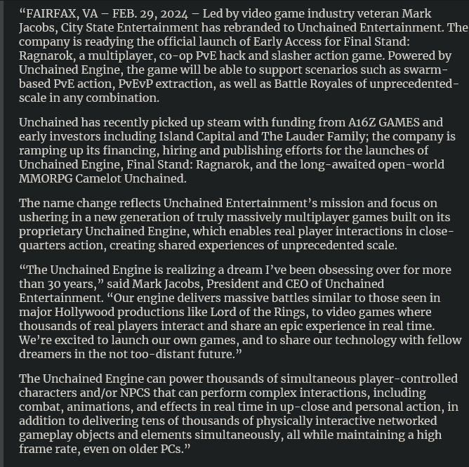 这份来自官方的公告更多的是在讨论公司的开发技术——名为“Unchained Engine”的游戏引擎。公司老板 Mark Jacobs 将引擎称为“30 多年来一直痴迷的一个梦想”,并表示:“我们的引擎提供了类似于《指环王》等好莱坞大制作中所见的大规模战斗,以及数千名真实玩家互动并分享史诗般体验的游戏。我们很高兴嫩巩固推出自己的游戏,并在不久的将来于其他梦想家分享我们的技术。”