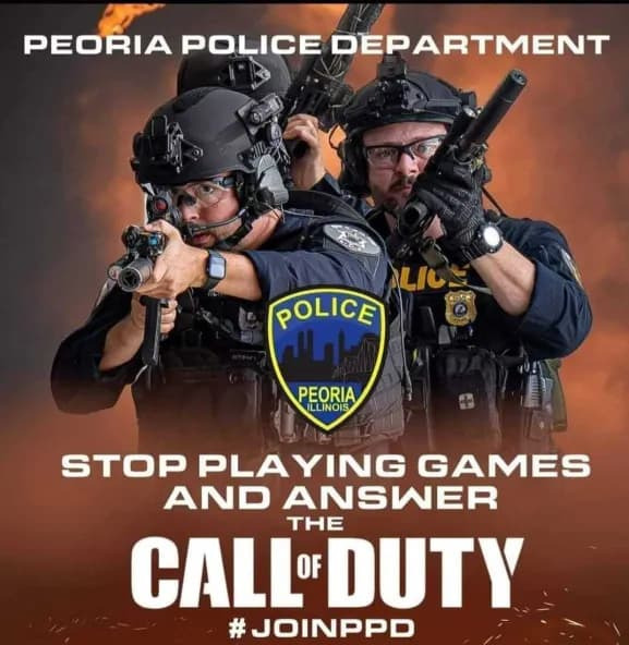 美国伊利诺伊州皮奥里亚警察局决定制作一张招募海报,上面不仅写着“使命召唤”,还引用了该系列多年来使用的各种电子游戏海报和封面风格。显然,他们的意图是利用这款游戏的知名度为警察局招募更多新人。