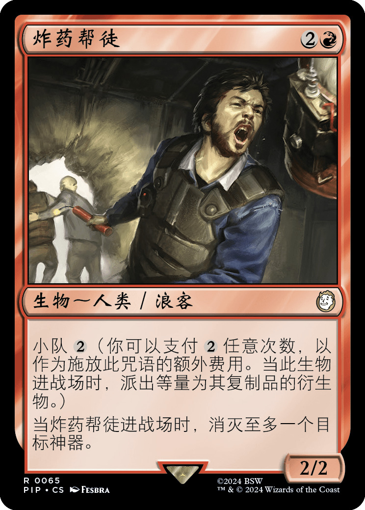 炸药帮上还有一个异能,会在其进入战场时触发,因此其每个复制品衍生物也会如此。这样一来,你就能够消灭至多四个目标神器。大多数具有小队异能的牌都有类似异能~数量越多,带来的优势就越大,更不用提黑压压的复制品衍生物本身就能让你笑傲全场。