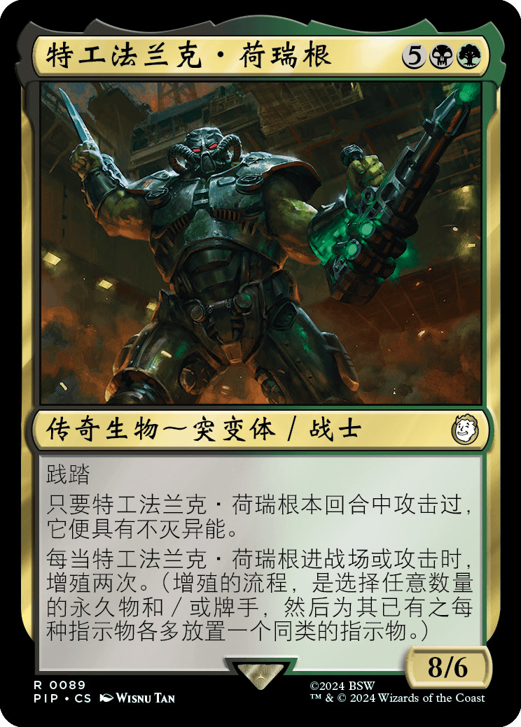 万智牌故事当中虽也不乏全世大战与末日灾祸,但这次跟以前截然不同。眼前所见仍是熟悉的复古未来式地狱景象,但闯荡方式已焕然一新。Magic: The Gathering® – Fallout®(万智牌~辐射)是无疆新宇宙最新的联名系列,它将带你重回废土,面对《Fallout》(辐射)各代游戏中的知名人物与角色,是敌是友端看你的选择。本系列产品包括四副指挥官套牌和聚珍补充包,其中不乏全新牌张,而这些新牌上还有全新机制。所以请各位坐下,放松心情,打开核子可乐,细细读下去。