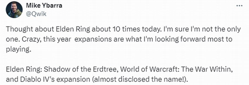 Ybarra表示:“今天我大概已经想了10次《艾尔登法环》,我相信我不是唯一一个这样的。疯狂的是,今年要发售的资料片都是我最想玩的,比如《艾尔登法环:黄金树之影》、《魔兽世界:地心之战》和《暗黑破坏神4:憎恨之躯》。”
